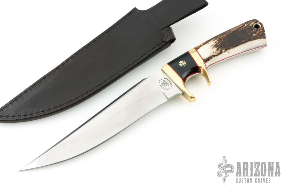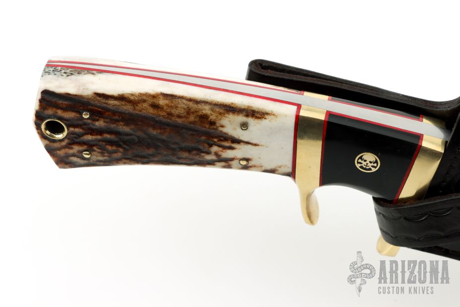 This Sub-Hilt Fighter from Ricardo Perpina features a satin finish clip point blade with a falsetop edge, notched thumbrest and a full tapered tang, .234" blade stock and 1.556" blade depth.  The handle has a brass guard and sub-hilt with stag scales and red liners, brass and mosaic pins. Comes with a brown leather sheath. New from maker.