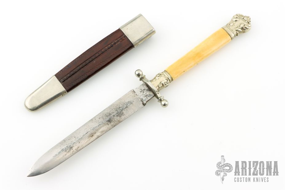 This antique bowie by J. Rodgers & Sons features a satin finished dagger blade, with .130" blade stock and .763" blade depth, hidden tang construction. The handle has a nickel silver guard, collar, and butt, with a bone grip. Has a leather and metallic belt sheath. Has some patina, scuffs, and some light scratches. Good condition for its age and otherwise.