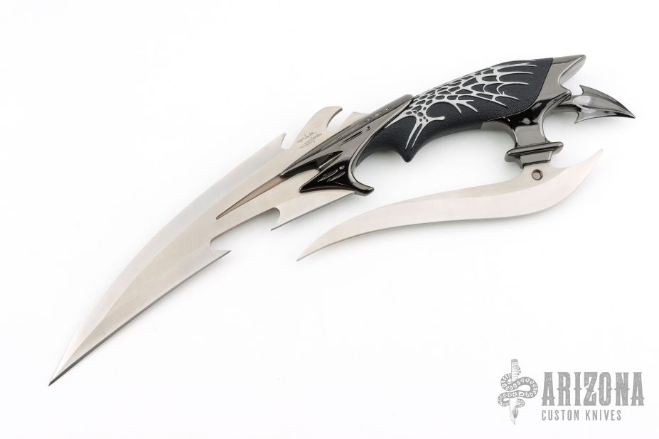 This fantasy knife features two stainless steel blades and solid metal handle parts with a polished black chrome finish.