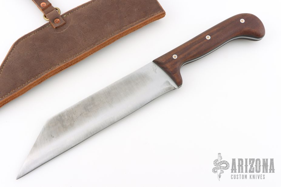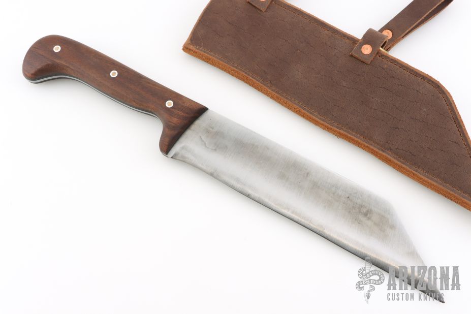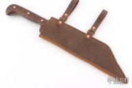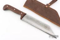 This Large Seax by Rick Fosnight features a satin finished blade with .120" blade stock and 2.084" blade depth, full tang construction. The handle has walnut covers with micarta liners, and Loveless bolts. Comes with a thick leather belt sheath. Has some scratches and patina. Excellent condition.