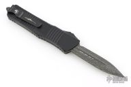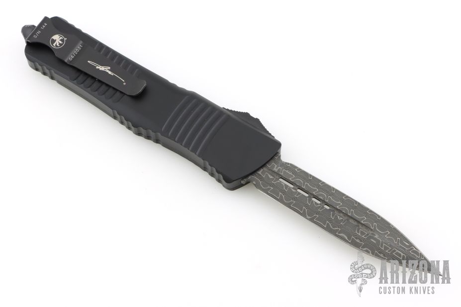 This Combat Troodon by Microtech Knives features a Damascus double-edged blade. The handle is black aluminum and carbon fiber, ringed titanium screws, and a black stainless steel pocket clip. The handle is marked "A. Marfione" and dated 06/2021 and #144 on spine of handle and claw logo. Comes with original box and papers. Excellent condition.