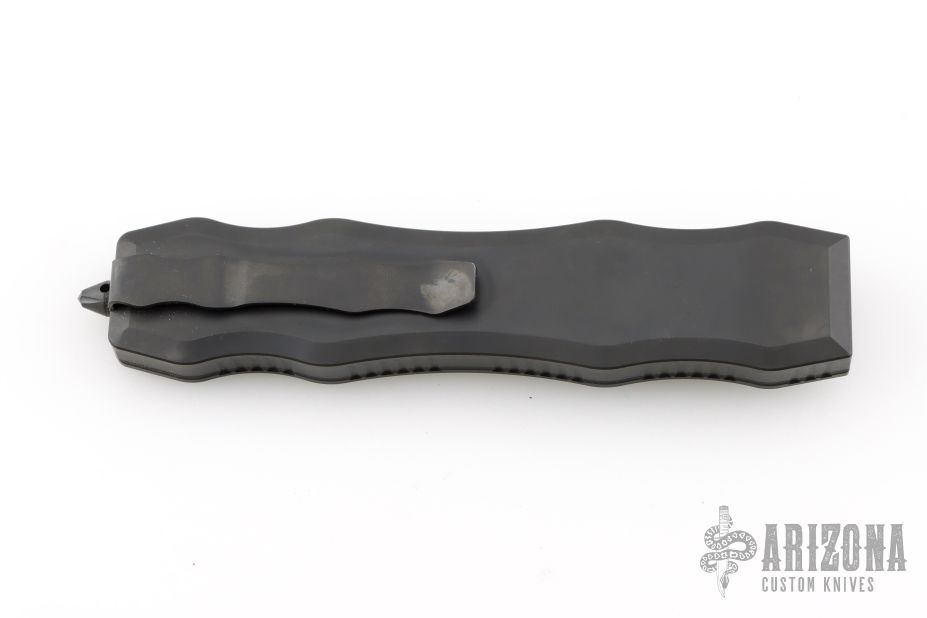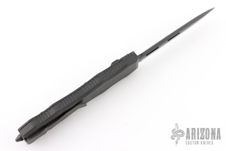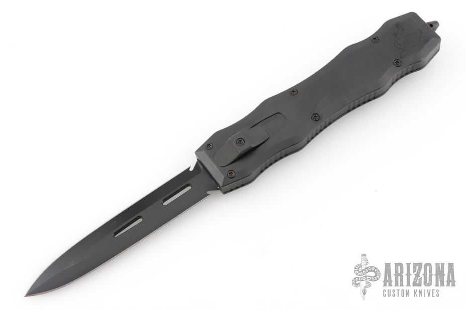 This Brand New Sand Shark OTF double action automatic by Desert Knife Works features a DLC finished double edge blade and a DLC 420 stainless steel handle with matching tip down clip. Comes with original tube and soft pouch. Excellent condition.