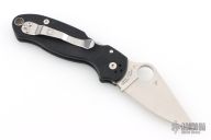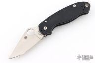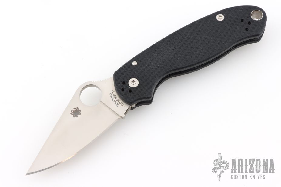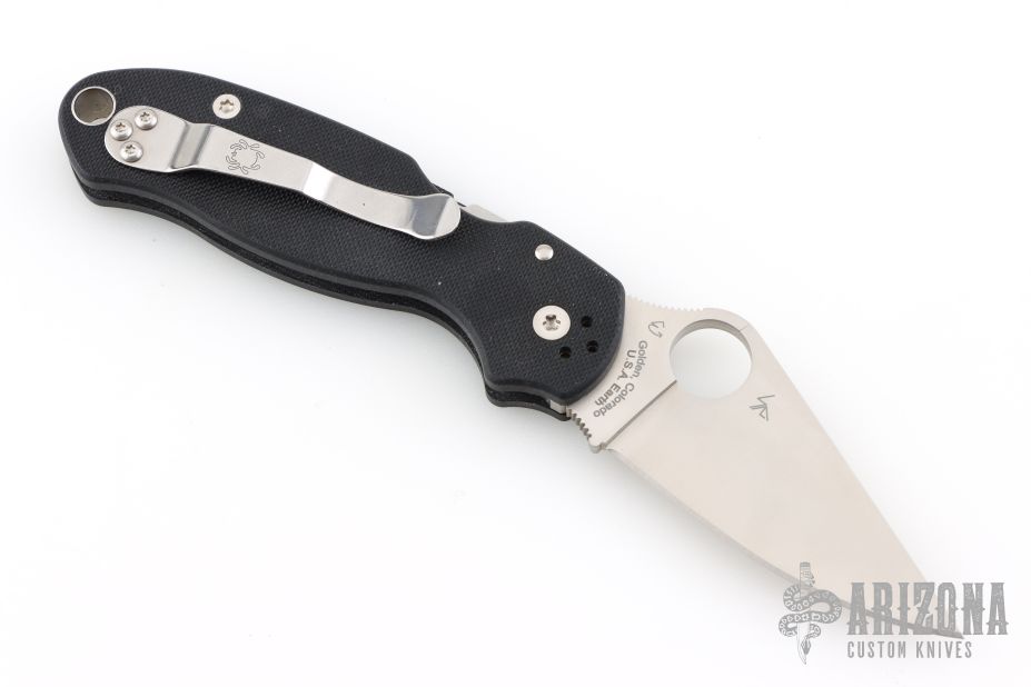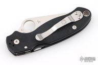 This Para 3 by Spyderco features a satin finished clip point blade with thumb hole and notched thumbrest. The handle has black G-10 frame over nested steel liner and stand-offs. The steel pocket clip is 4 way adjustable. Includes original box and paperwork.  Excellent condition.