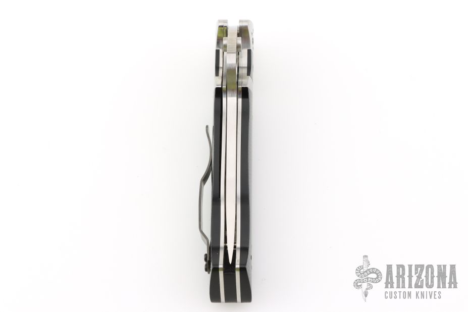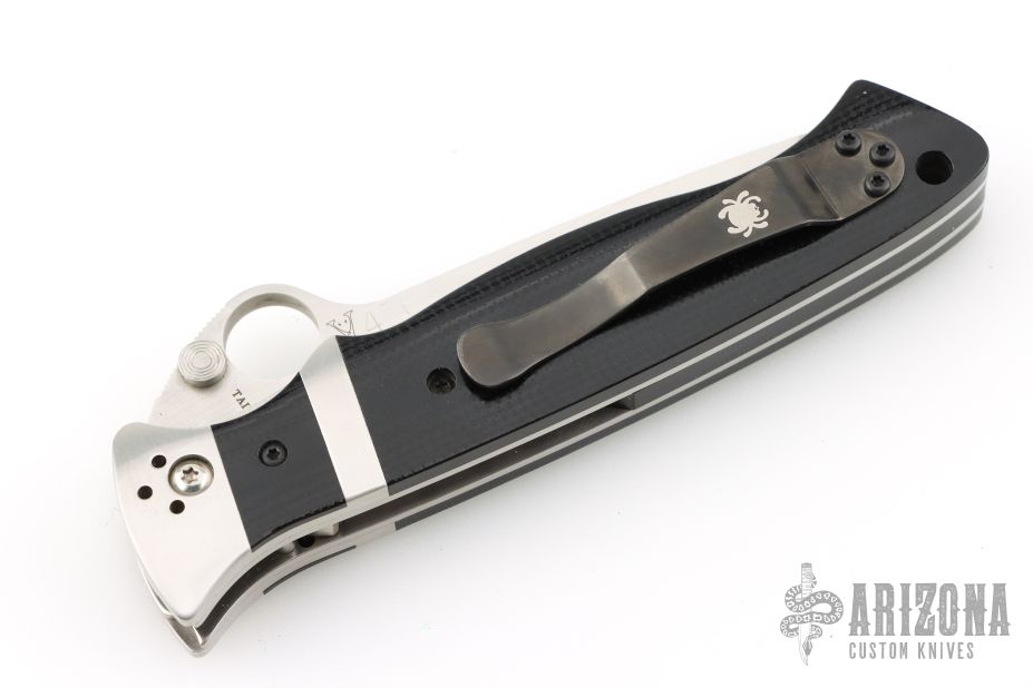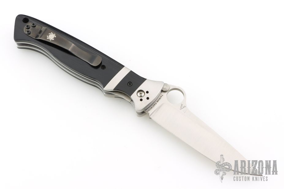 This Vallotton Sub-Hilt Auto by Spyderco was converted by Butch Vallotton, it features a satin finished S30V blade with a thumb-hole, dual thumb-studs, and notched thumbrest. The handle has stainless steel bolsters, black G-10 scales, stainless steel liners, black G-10 backspacer, and 4-way reversible black stainless steel clip. Nice detent, lockup and blade seating, but if you fire the knife, the kick spring gets in the way of the liner engaging the blade, a little more of the locking liner needs to be removed from the backside. Can be opened manually or as an auto. Comes with original box and papers. Excellent condition.