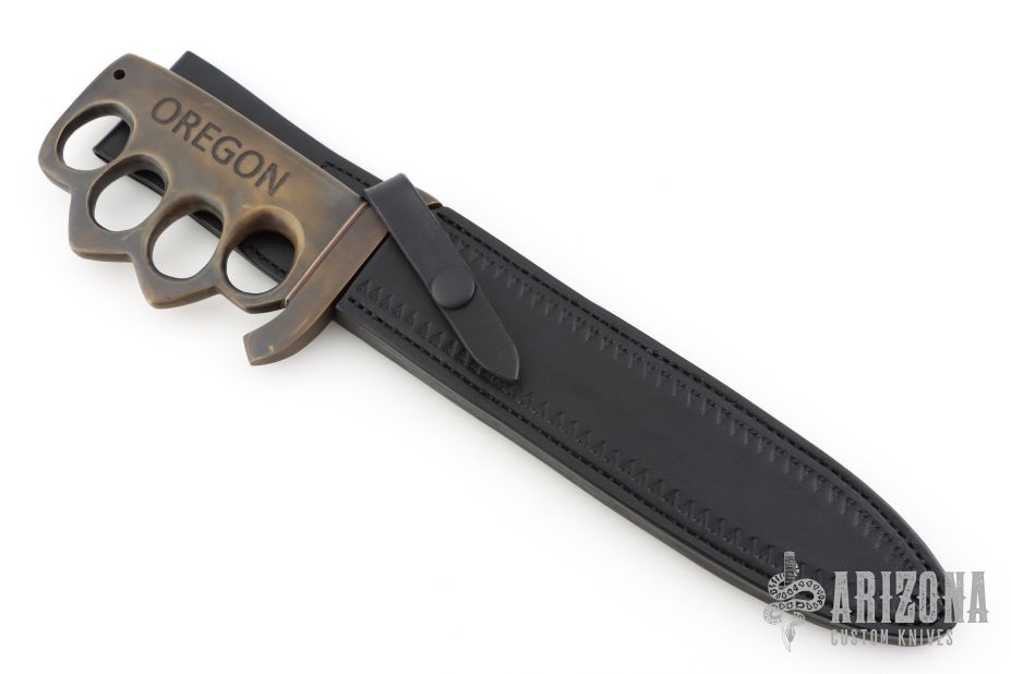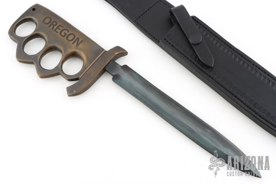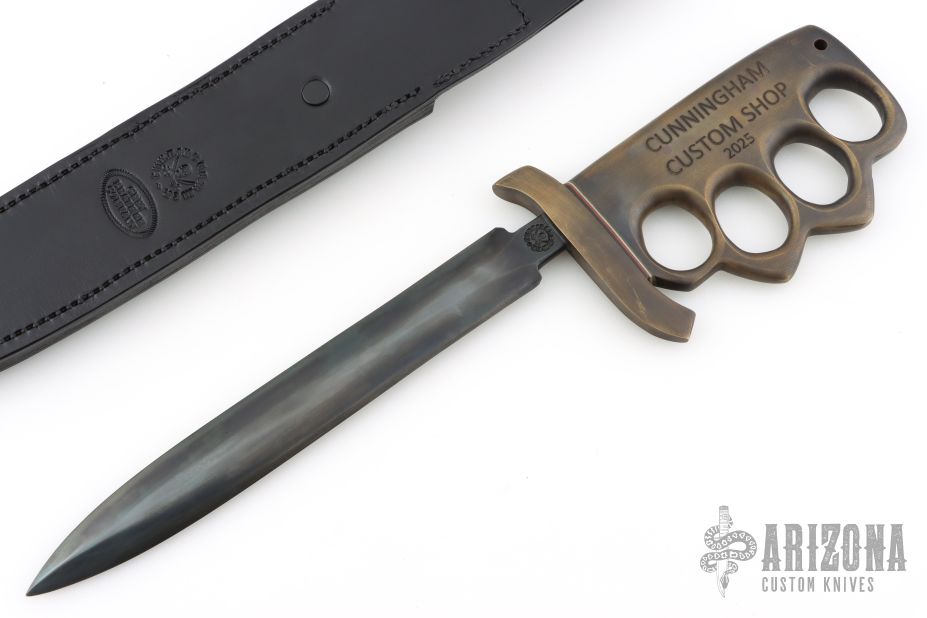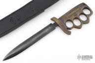 This Trench Knife Reproduction by Grant Cunningham features a double-edged forged blade with a blued finish.  .633" Blade Stock.  1.193" Blade Depth. The handle has a brass guard and grip with black, red and white spacers.  Includes a black leather sheath, a padded zippered case and COA. Serial #195.  New from Maker!