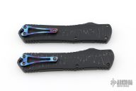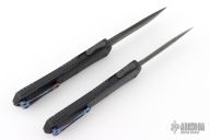 This model of the Manticore-X comes equipped with a black flintnapped d/e blade and a flintnapped black aluminum handle. The Heretic Knives Manticore-X is a full size Out-the-Front knife with a clean and functional aesthetic. It features a contoured aluminum chassis with jimping all along the sides. This lightweight and capable OTF knife opens and closes smoothly, making for an excellent everyday or tactical carry. Comes with a ball-bearing glass breaker and a flamed titanium pocket clip.