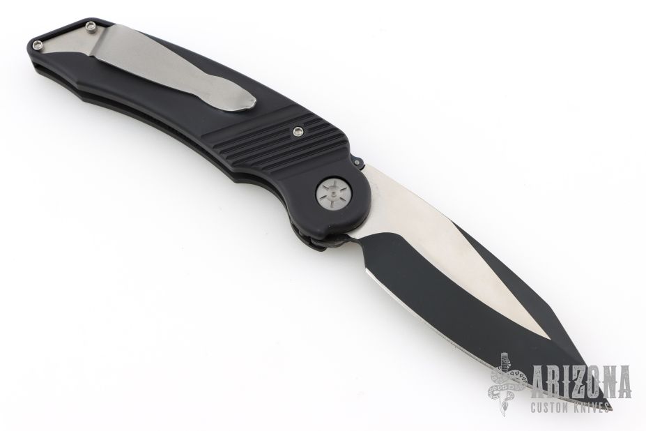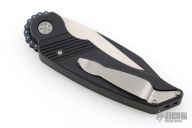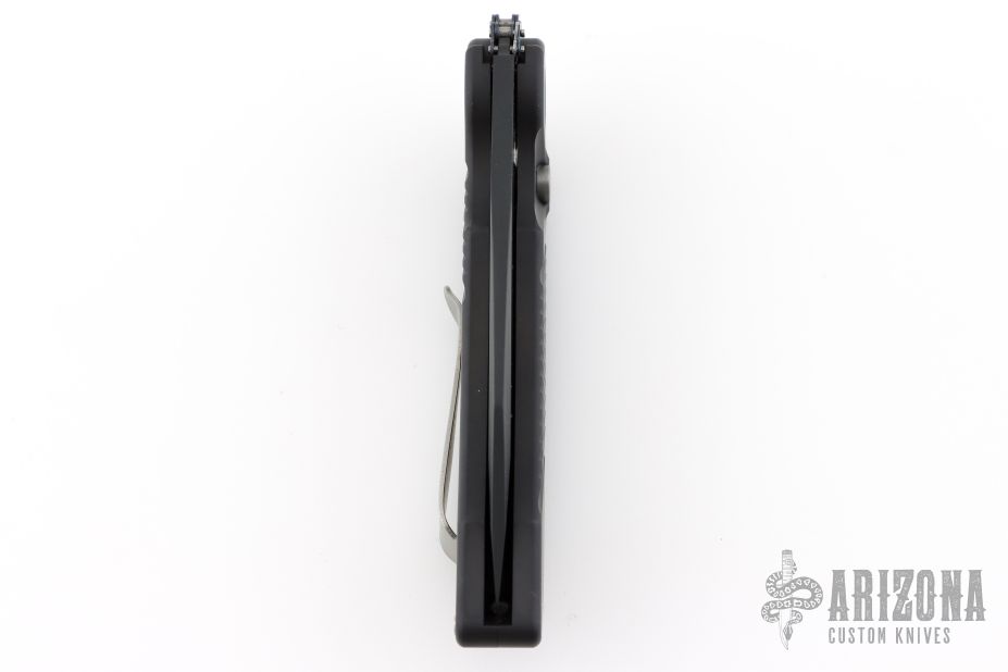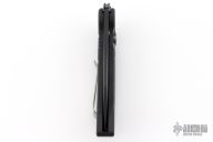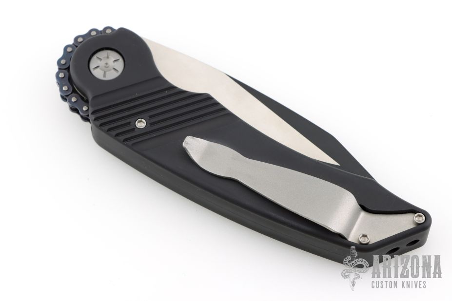 This MRX by Rat Worx features a black drop point blade. The handle is black aluminum with a chain drive opening mechanism. Tip up bead blast finished stainless clip. Comes with original box, papers and zippered case. Excellent condition.