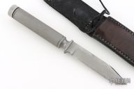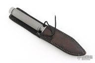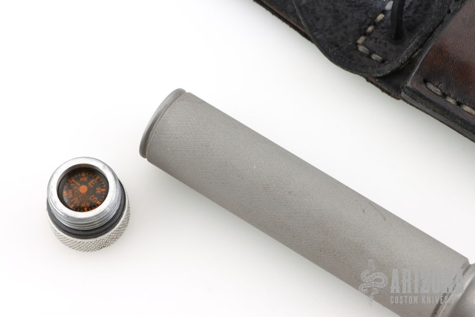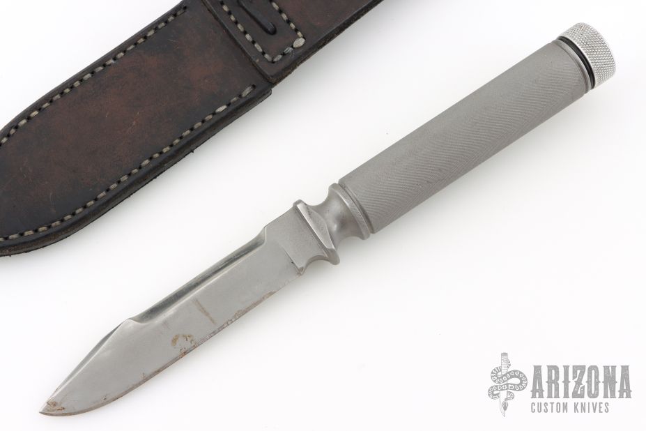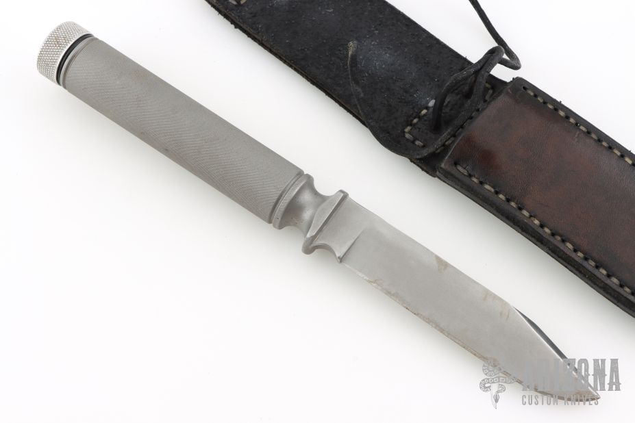 This knife by Mike England features a bead blasted blade with a thick sharpened top edge, .255" blade stock and .948" blade depth. The has a bead blasted stainless steel guard with an integral hollow stainless steel handle with knurled grip, has removable bead blasted aluminum butt cap with compass. Comes with a black leather sheath. Has some scuffs and scratches, has some oxidation spots, otherwise good condition.