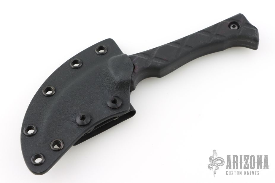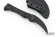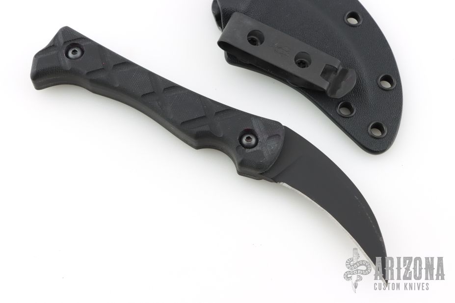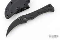 This knife from Variant One features a black hawkbill blade with .165" bladestock and 1.016" blade depth with full tang construction. The handle is comprised of textured G10 covers, and black hardware. Comes with Kydex sheath with metal clip. Has some light scuffs and scratches, great condition otherwise.