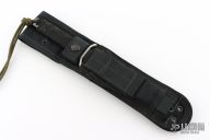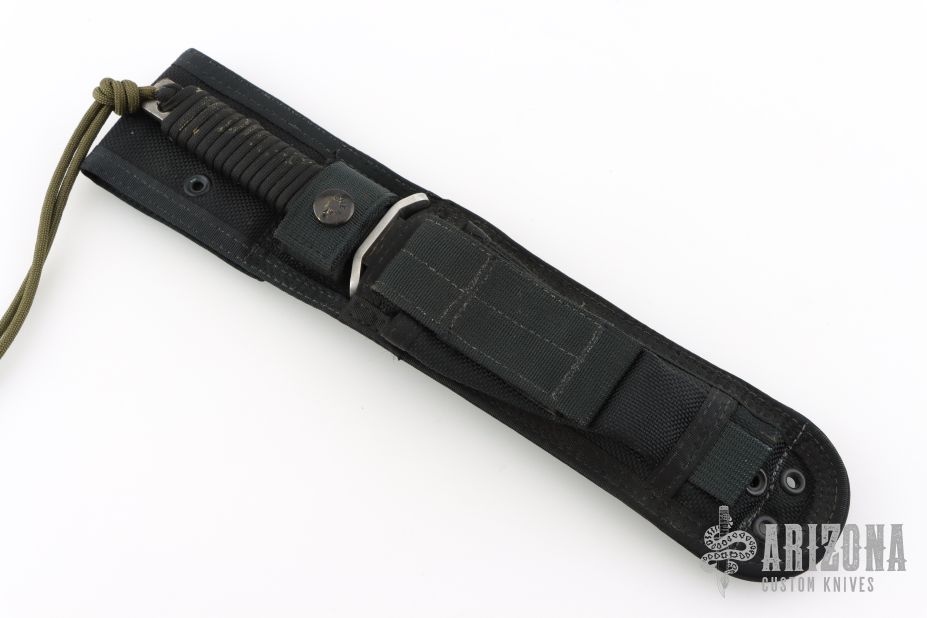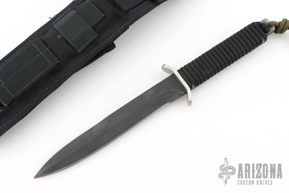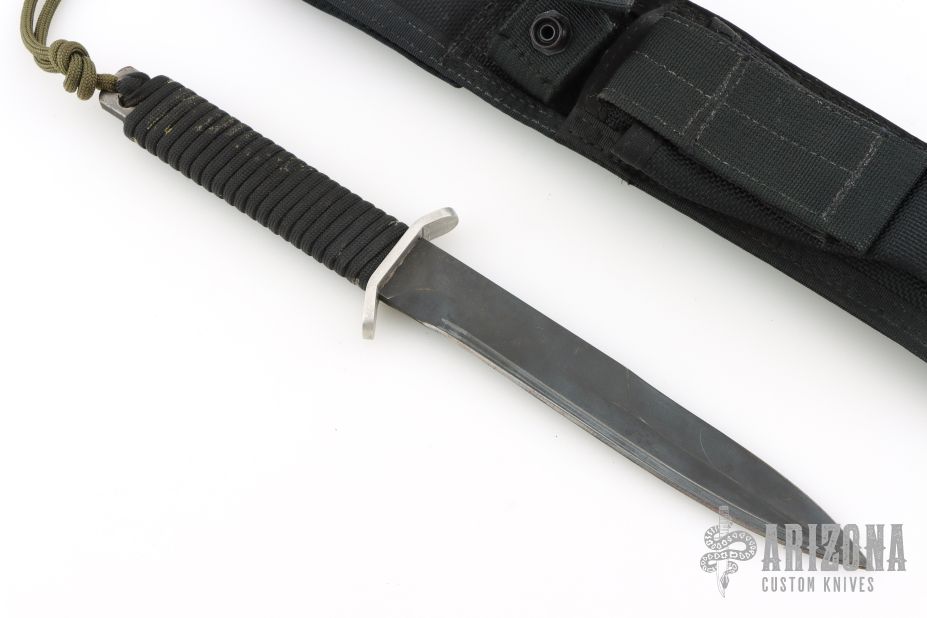 This fighter by Mike England features a black blade with sharpened top edge, .196" blade stock and .905" blade depth, full tang construction with an aluminum guard and a cord wrapped grip. Comes with a black nylon sheath. Has some scratches, otherwise good condition.