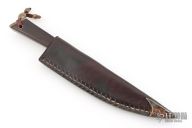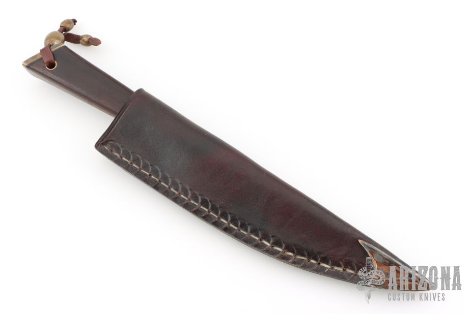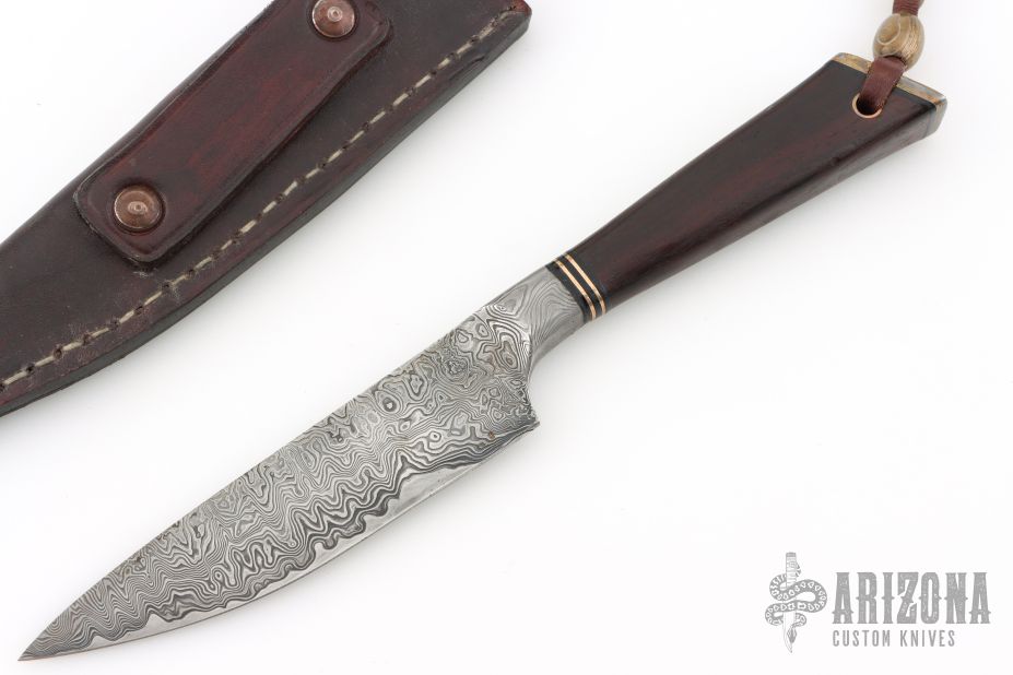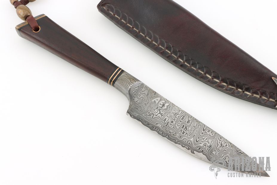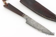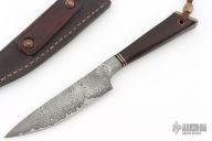 This knife by Ariel Elias Salaverria features a San Mai Damascus blade with .295" blade stock in front of the guard and 1.376" blade depth, hidden tang construction. The handle has a Guayubira wood grip with mokume butt and black spacers. Comes with a brown leather sheath. Has a light patina. Excellent condition. Very cool piece.