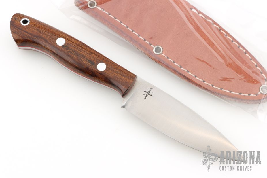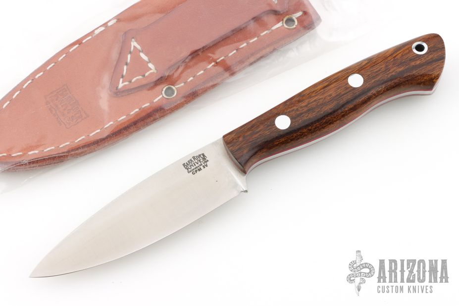 This Mini Aurora by Bark River Knives features a satin finished blade with .125" blade stock and 1" blade depth, full tang construction. The handle has desert ironwood scales with red liners. Comes with a brown leather sheath and original box. Excellent condition.