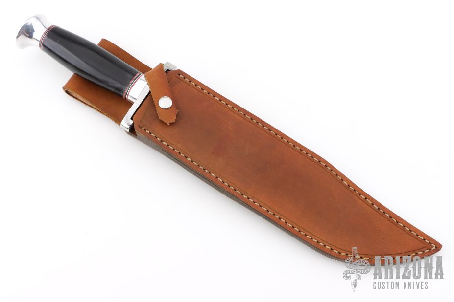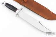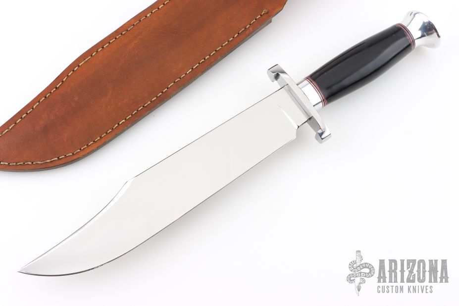 This large Bowie by Steve Voorhis features a mirror polished clip point blade with false top edge, .199" blade stock, 1.953" blade depth, hidden tang construction. The handle has a stainless steel guard, aluminum spacer and pommel, black laquered wood grip with red/aluminum/black spacers. Great feel in hand. Has a few very light scratches, otherwise excellent condition. Comes with a brown leather sheath.