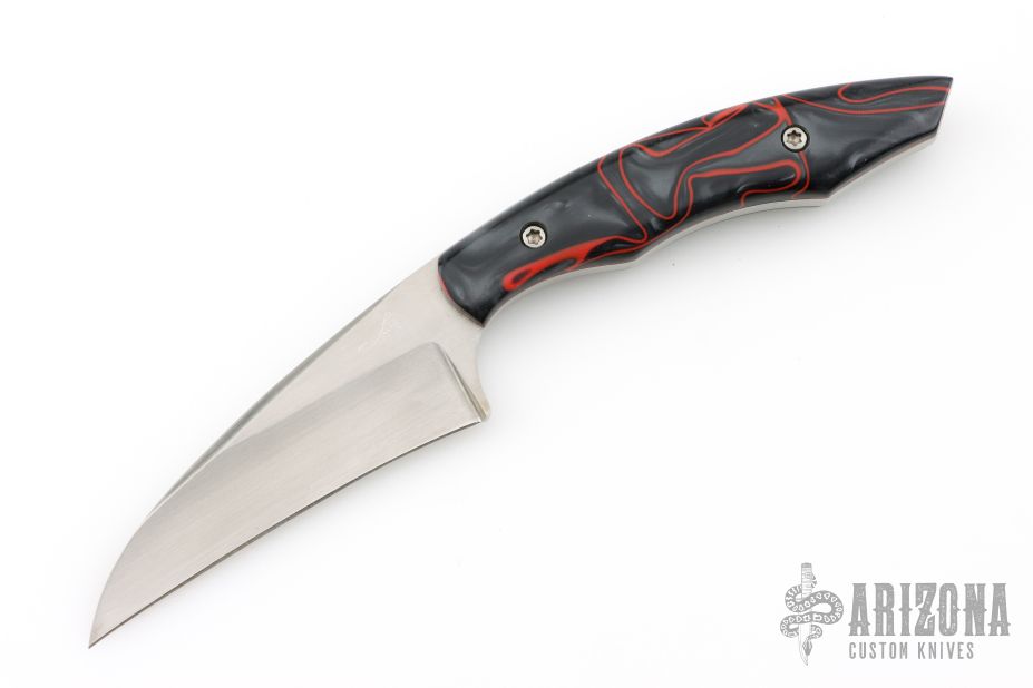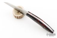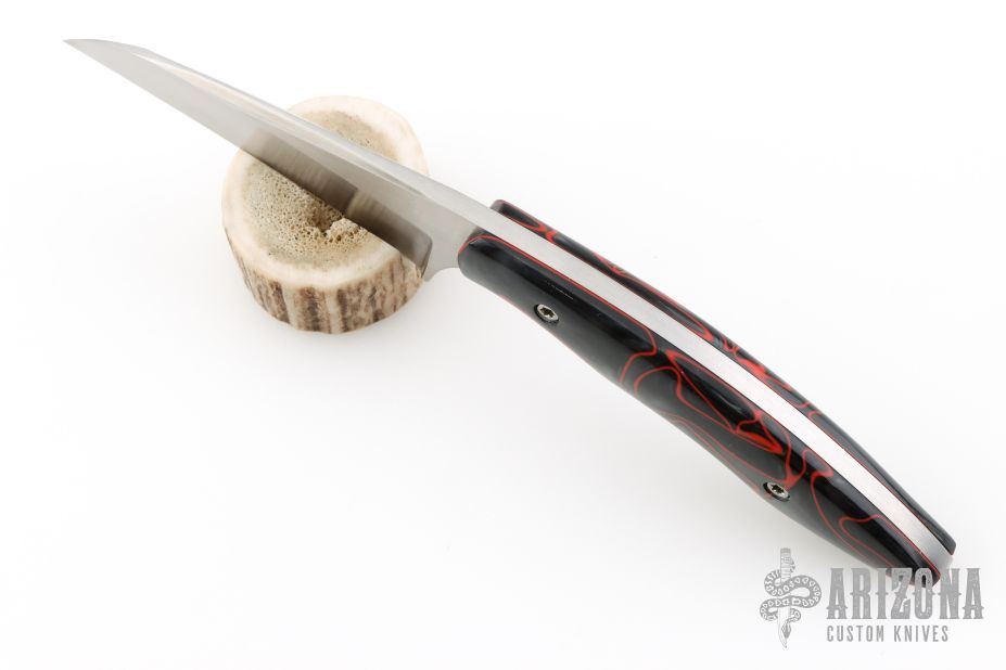 This knife by Melvin Lozada features a hand rub satin finished blade with .196" blade stock and 1.415" blade depth, full tang construction. The handle has kirinite scales. Has a couple light scratches, otherwise excellent condition.