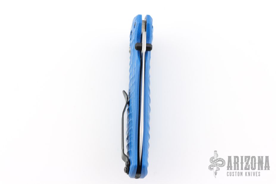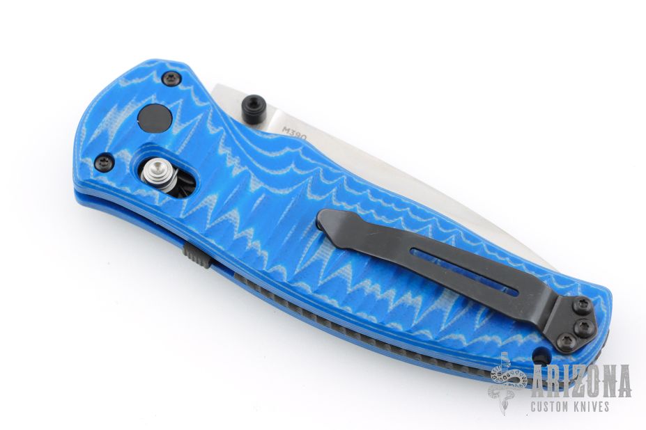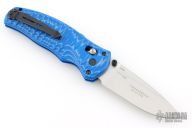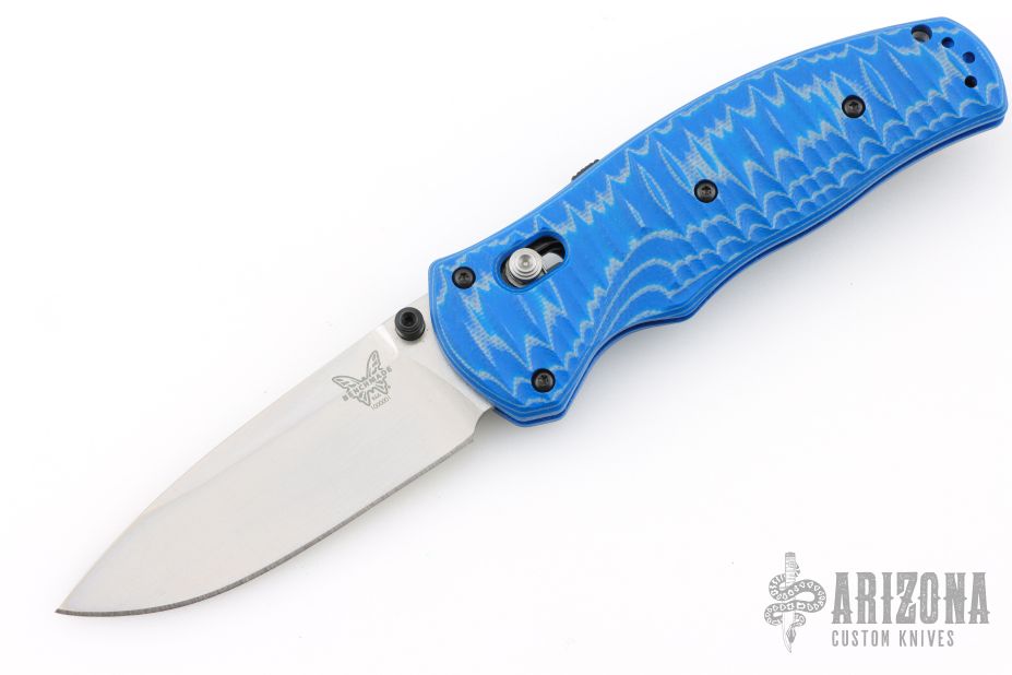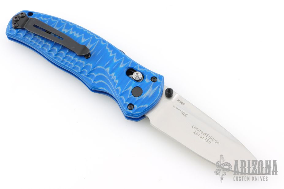 This 1000001-1601 Volli by Benchmade features a stonewashed drop point blade with swedge and dual thumb studs. The handle is comprised of carved and contoured blue/grey G-10 scales over a black coated steel sub frame and notched black G10 backspacer. Sliding safety on spine. Assisted opening with AXIS lock. Limited edition 261/750. Excellent condition. Comes with wrong Benchmade box (S/N 342/750), pouch and papers.