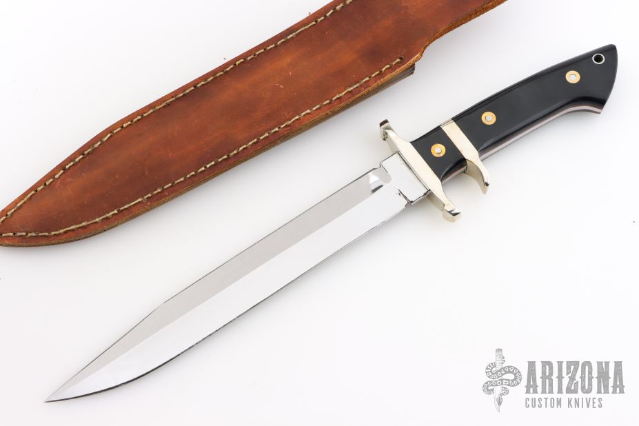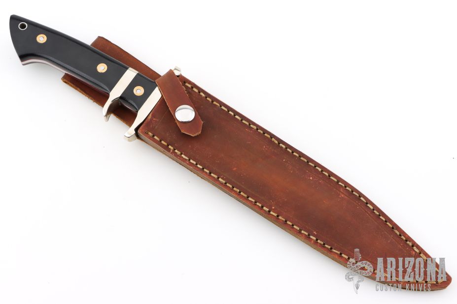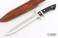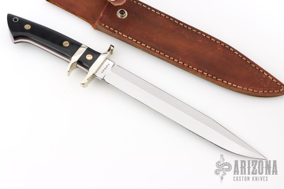 This Sub Hilt Fighter from Steve Voorhis features a mirror polished clip point blade with sharpened top edge, .219" blade stock and 1.240" blade depth, full tapered tang construction. The handle has a nickel silver guard and sub hilt, black canvas micarta scales over red liners. Comes with brown leather sheath. Excellent condition.