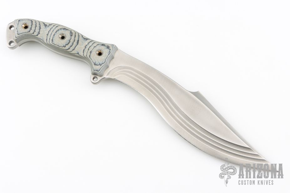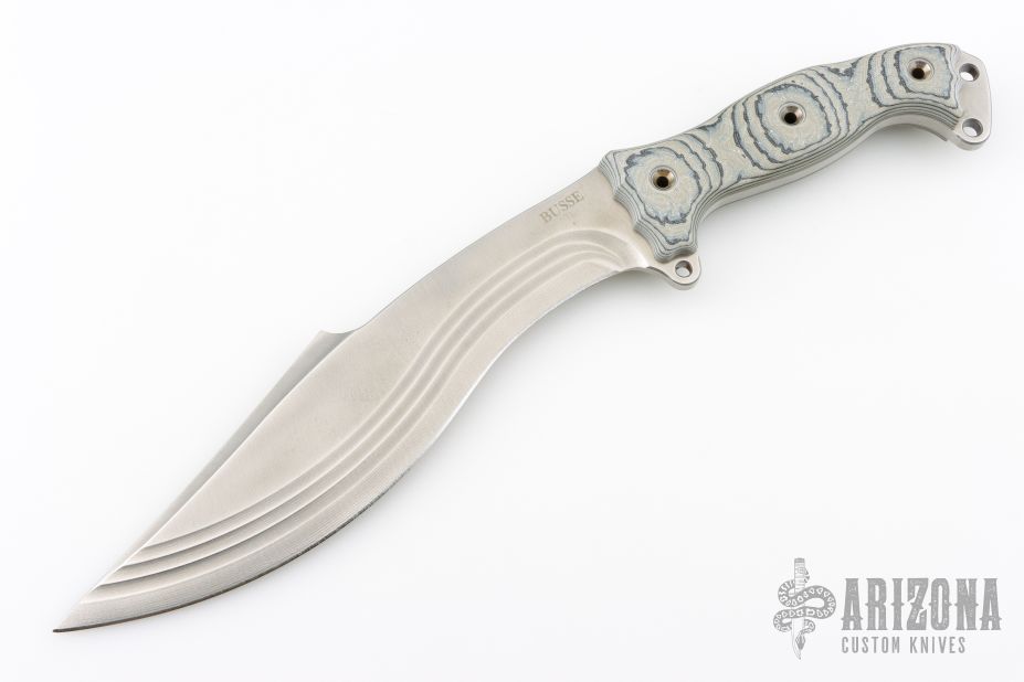 This HUCK FIN Kukuri from the Busse features a competition finished corrugated bevel blade with false top edge, .254" blade stock, 2.566" blade depth at its widest point. Full tang construction with black/tan G-10 scales, and tube pins. Excellent condition.