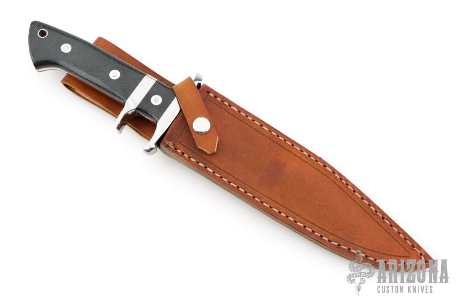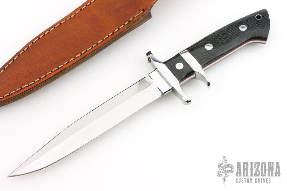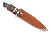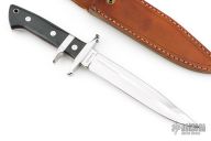 This Sub Hilt Fighter from Steve Voorhis features a mirror polished clip point blade with sharpened top edge, .237" blade stock and 1.155" blade depth, full tapered tang construction. The handle has a nickel silver guard and sub hilt, black canvas micarta scales over red liners. Comes with brown leather sheath. Excellent condition.