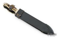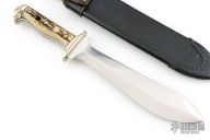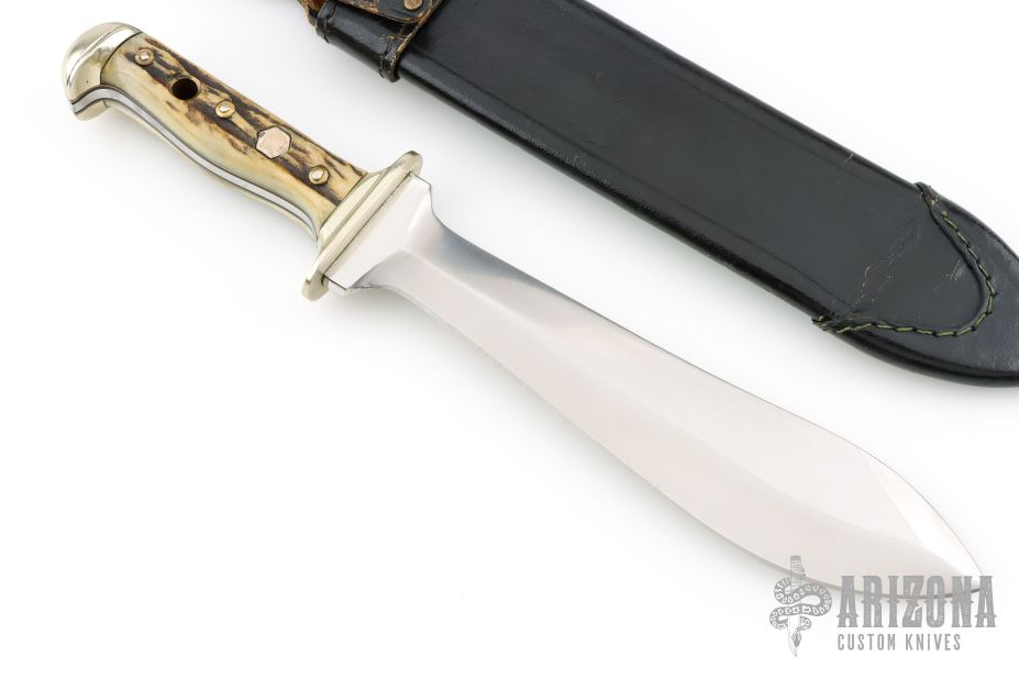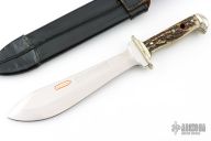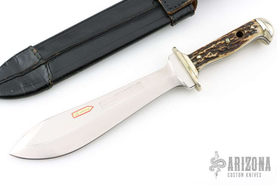 This Puma Original Waidblatt features a satin finished blade with false top edge, .305" blade stock and 1.875" blade depth, full tang construction. The handle has a nickel silver guard, stag scales with brass and black liners, nickel silver butt. Comes with original leather sheath. Has light scratches, otherwise excellent condition.