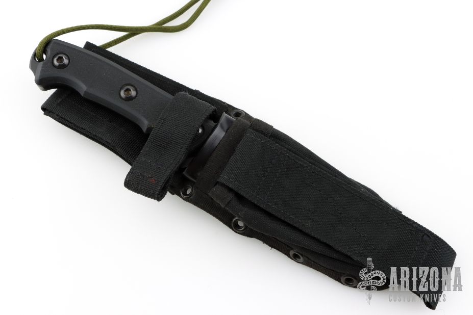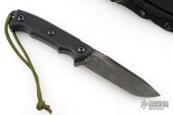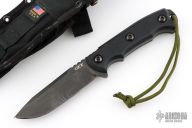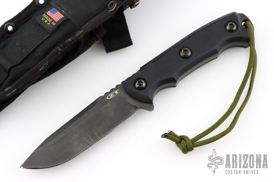 This ZT-0180 is a Rick Hinderer design executed by Zero Tolerance. It features a DLC coated clip point blade with swedge and notched thumb rest crafted from Vanadis 4 extra steel The handle is comprised of textured black G10 scales over full tang construction. Exposed tang pommel with lanyard hole. Includes Spec-Ops brand sheath with belt loop. Has some scuffs and scratches, otherwise good condition. #0533