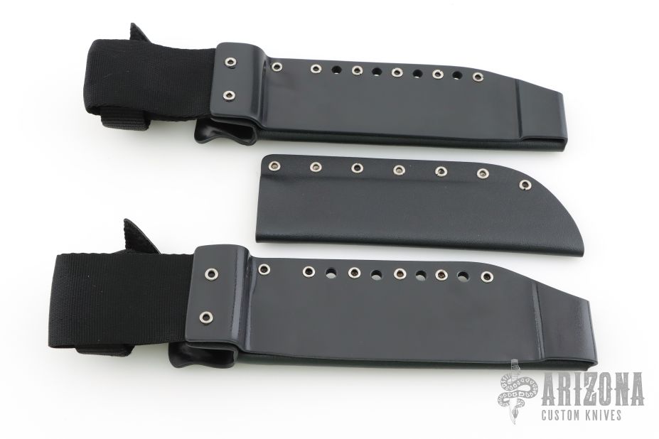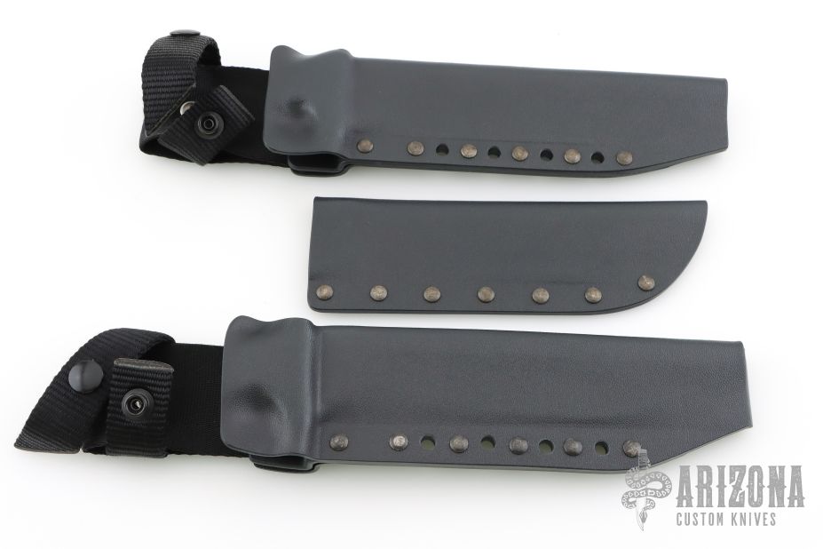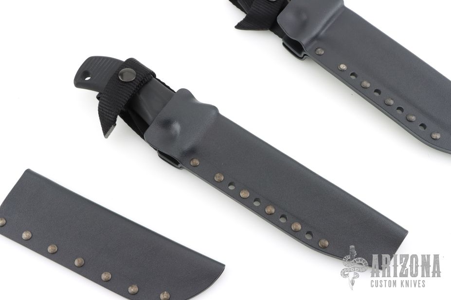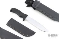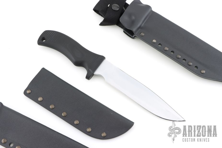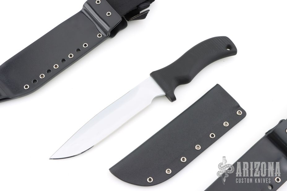 This Voodoo Hound by Mad Dog Knives features a double edged blade with .189" stock and 1.337" blade depth. Selectively tempered, the knife has a Rockwell C-scale hardness of 62 at the edge (as hard as a file), and HRC 50-54 throughout the spine and hidden full tang. Hard chrome blade finish. The handle is designed to be ergonomic and has the ability to withstand tremendous punishment with little or no damage. It is hard and tough enough to be used as an impact tool. Includes a kydex slip sheath and two ATAK Sheaths. Excellent Condition.
