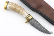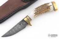 This knife by Ray Rantanen features a hand forged Damascus blade (224 layers) with notched thumbrest, .120" blade stock and 1.12" blade depth, hidden tang construction. The handle has a brass guard and butt, stag grip with black/white/brass spacers. Comes with a brown leather belt sheath. Excellent condition.