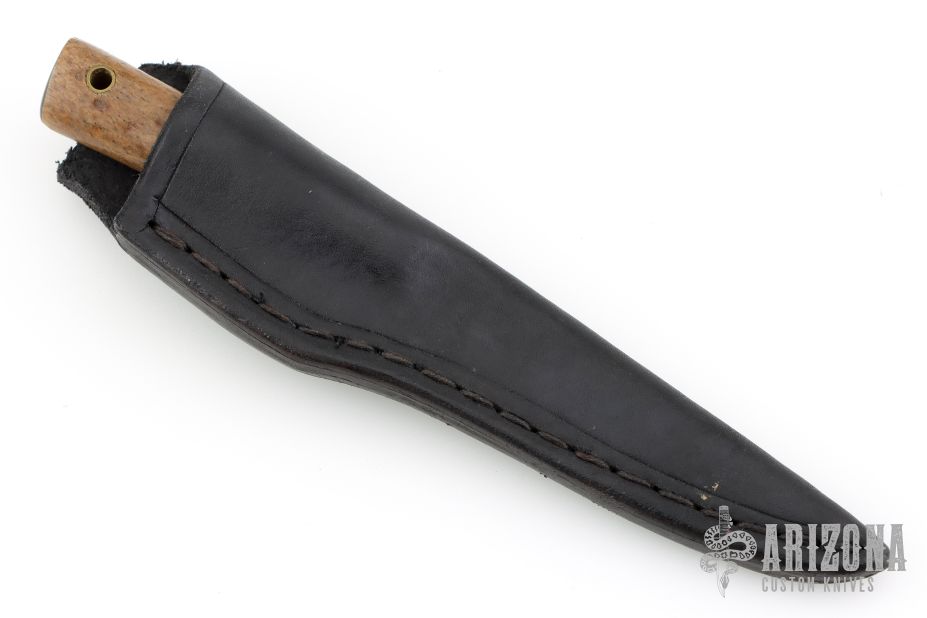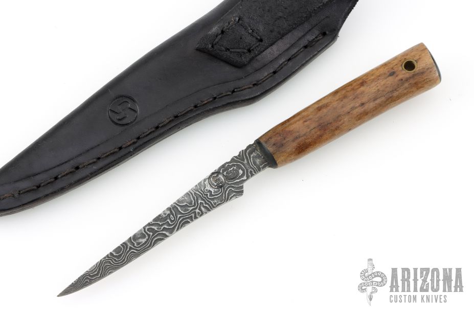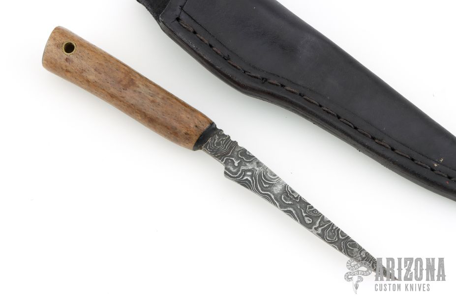 This knife by Ray Rantanen features a hand forged Damascus blade (224 layers) with notched thumbrest, .118" blade stock and .635" blade depth, hidden tang construction. The handle has an Oosik grip with lanyard hole. Comes with a black leather belt sheath. Excellent condition.