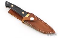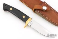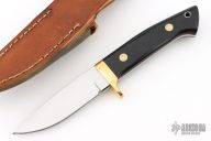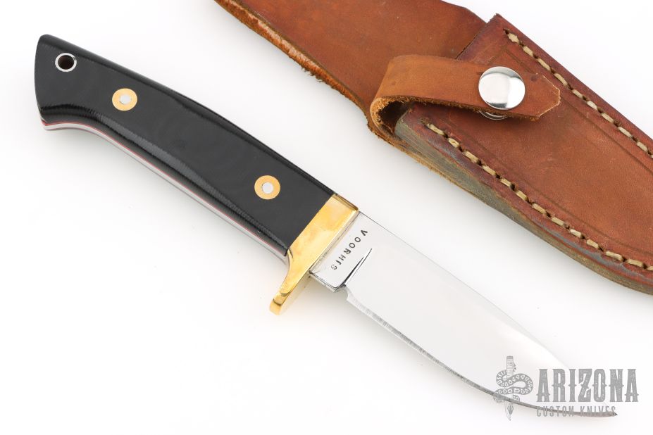 This Drop Point Hunter by Steve Voorhis has a mirror polished drop point blade with full tapered tang construction, blade stock is .178", depth 1.050". Handle has a brass single guard, black canvas micarta scales with red liners, lanyard hole at the butt. Comes with a brown leather sheath. Excellent condition.
