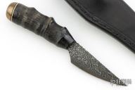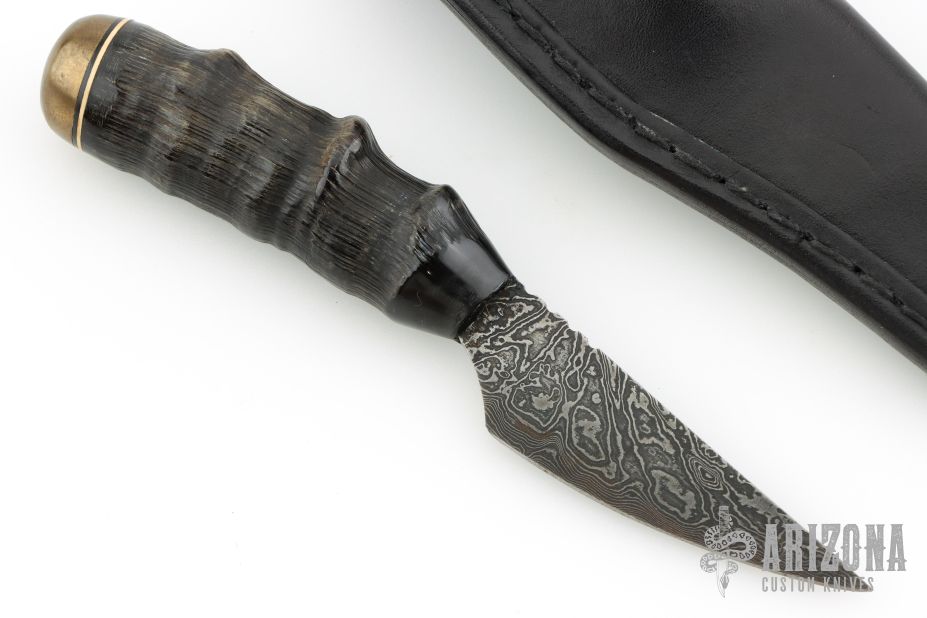 This knife by Ray Rantanen features a hand forged Damascus blade (224 layers "RayBurst" Pattern) with notched thumbrest, .090" blade stock and .922" blade depth, hidden tang construction. The handle has an Elk antler grip with brass cap, and black/white spacers. Comes with a brown leather belt sheath. Excellent condition.