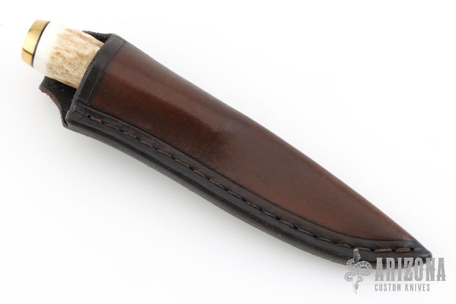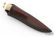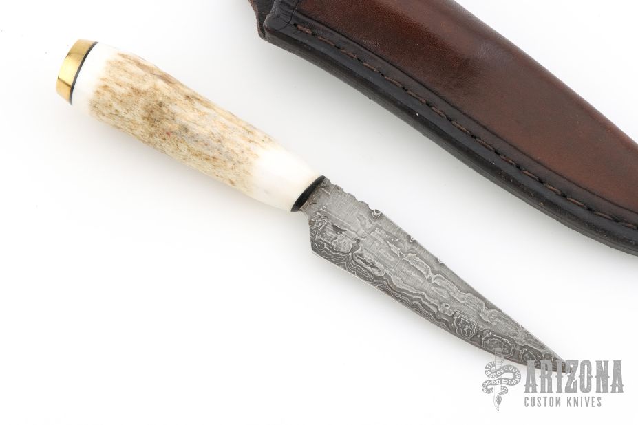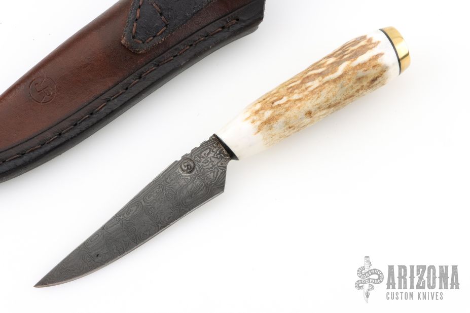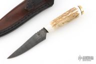 This knife by Ray Rantanen features a hand forged Damascus blade (224 layers) with notched thumbrest, .102" blade stock and .964" blade depth, hidden tang construction. The handle has an Elk antler grip with brass cap, and black spacer. Comes with a brown leather belt sheath. Excellent condition.
