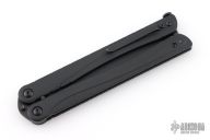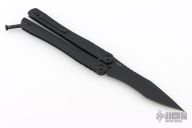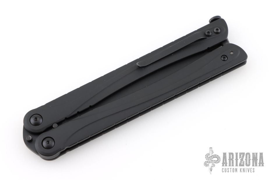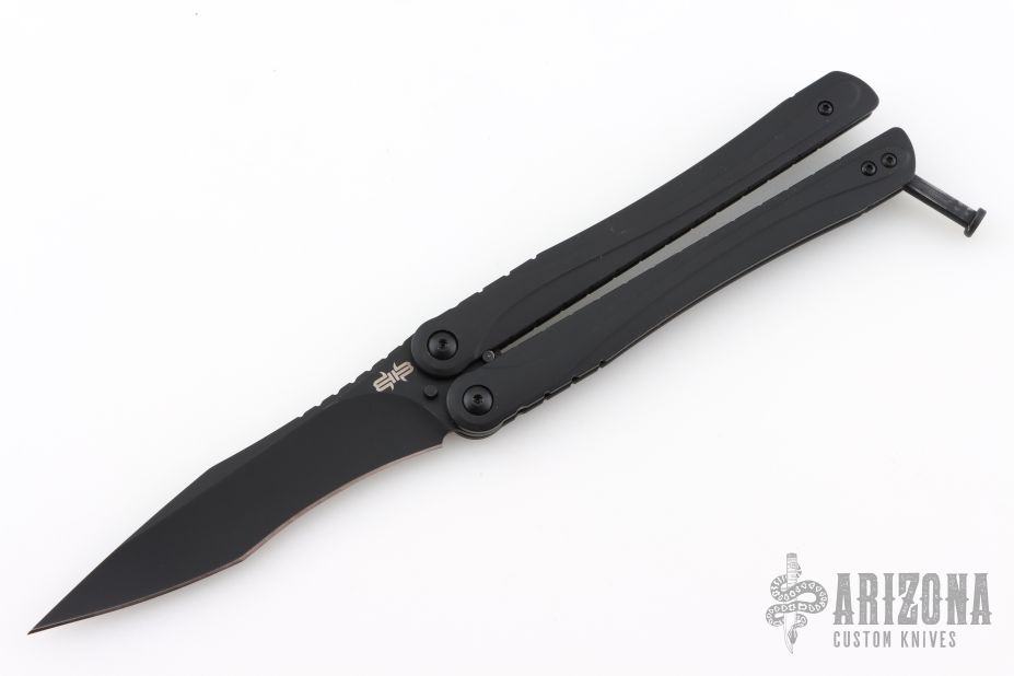 This Balisong from Brous Blades features a satin finished clip point recurve blade with notched thumbrest. The handle is comprised of a black finished stainless steel frame over barrel spacers, stainless steel tip up pocket clip. Numbered #73/500. Includes padded vault style case and COA. Has a couple light scuffs, otherwise excellent condition.
