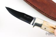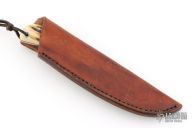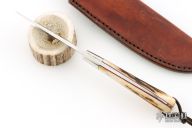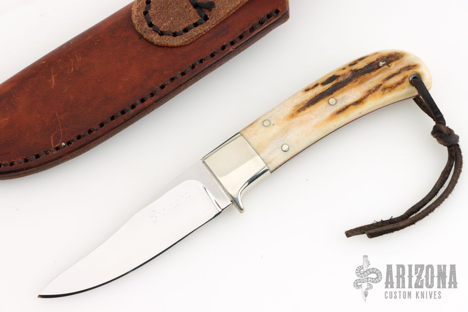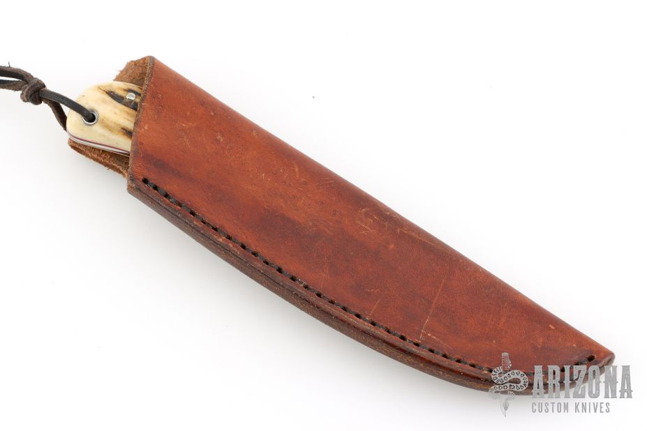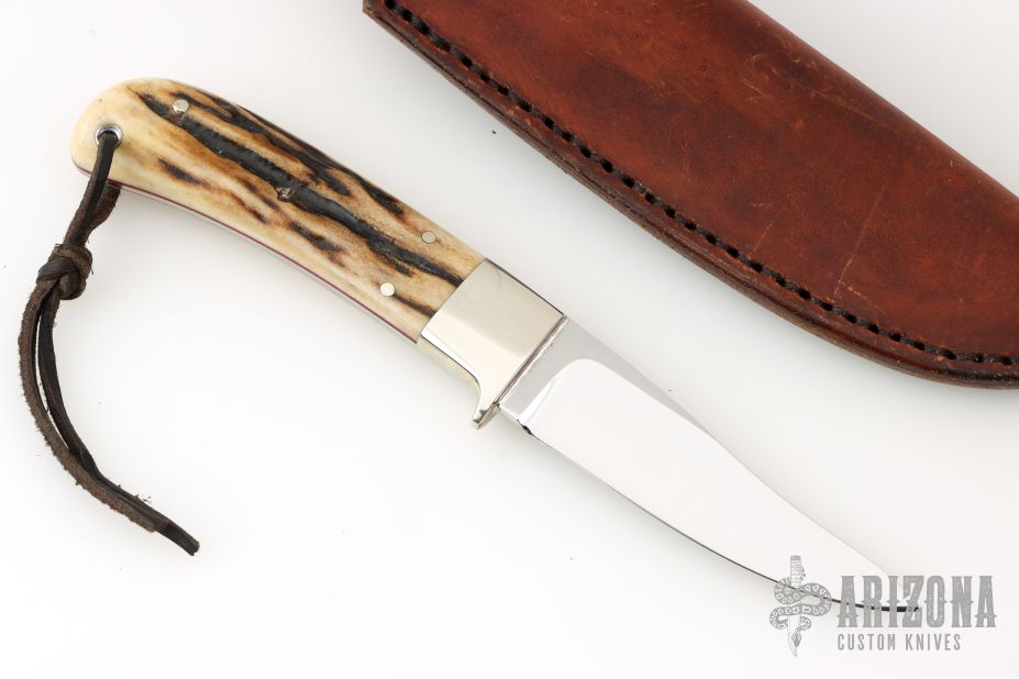 This knife by Pat Crawford features a mirror finished trailing point blade with .131" blade stock and .869" blade depth, full tapered tang construction. The handle has nickel silver guard, stag scales grip with red liners. Has a lanyard hole in pommel. Comes with a brown leather belt sheath. Has a couple light scratches, and some minor oxidation at the guard on the blade spine. Excellent condition otherwise.