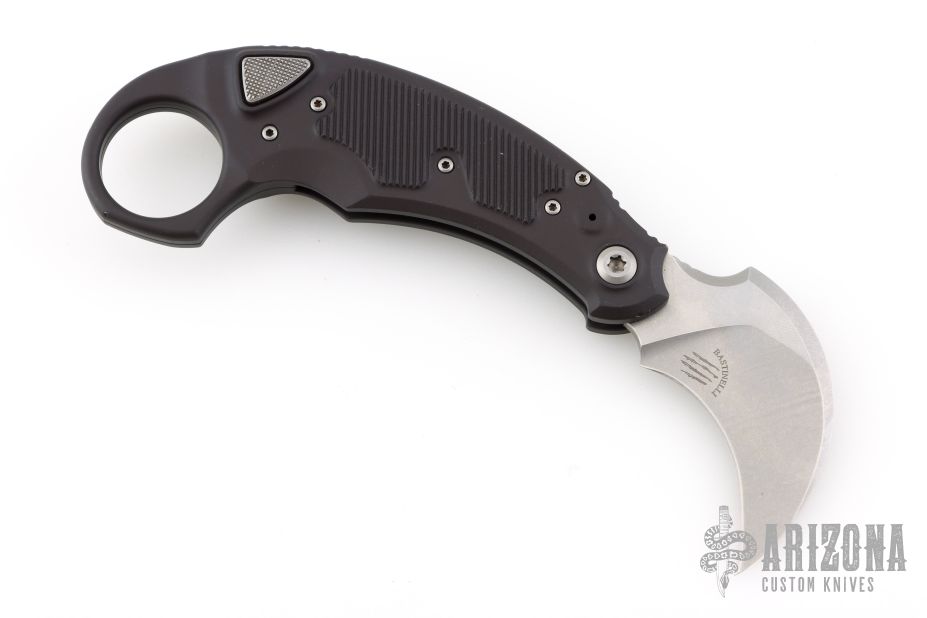 This Iconic Auto has a black handle and a stonewashed blade. Designed after the Iconic Karambit fixed blade, the Iconic Auto, made in collaboration with Bastinelli Creations, is a must-have innovative tactical knife. Most automatic knives open from a push button near the pivot, but the button on the Iconic is near the finger hole. Once you've de-activated the safety, you can open the blade with a button near the finger hole. Features: Premium stainless steel blade is tough and will hold it's edge. Unique push button action allows for a reverse grip during deployment. Finger hole allows for a secure and unbreakable grip. S/N 310 and dated 03/2020. Has some wear on the edges of the frame, otherwise excellent condition.