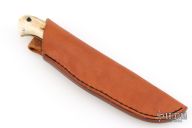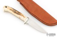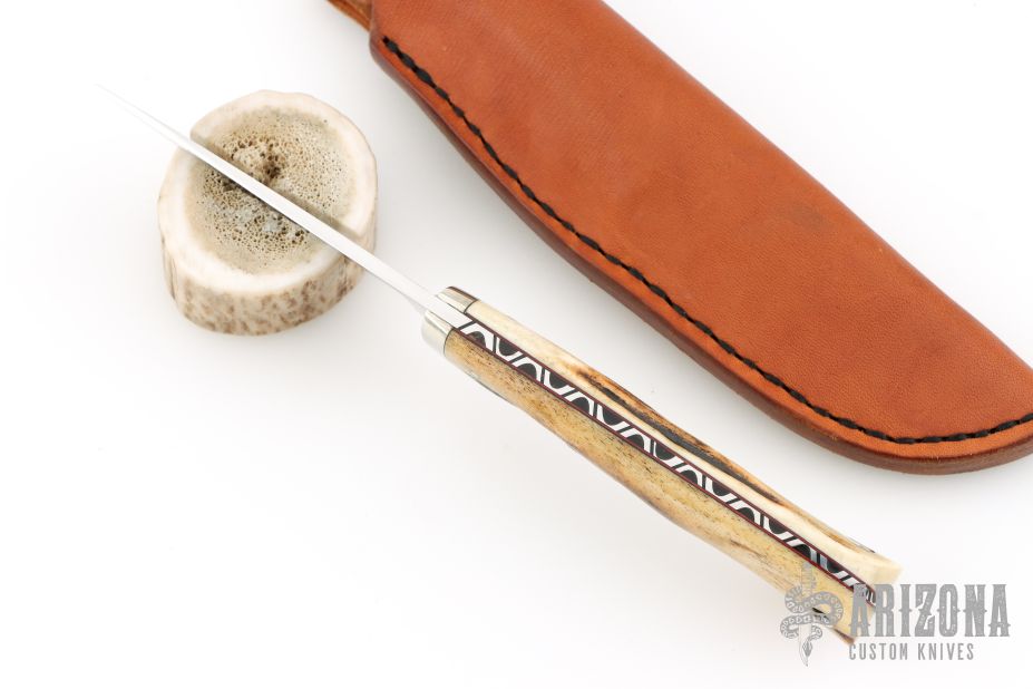 This knife by Pat Crawford features a mirror finished drop point blade with .124" blade stock and .853" blade depth, full tapered tang construction. The handle has nickel silver guard, stag scales with red liners. Has a lanyard hole in pommel and the belly and spine have been file-worked. Comes with a brown leather belt sheath. Has a couple light scratches, and a light patina. Excellent condition otherwise.