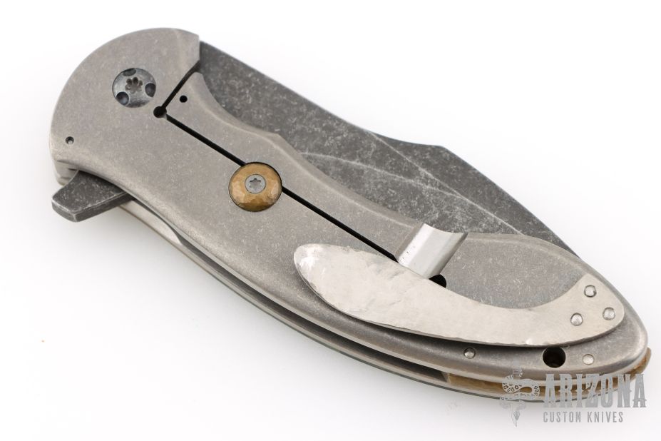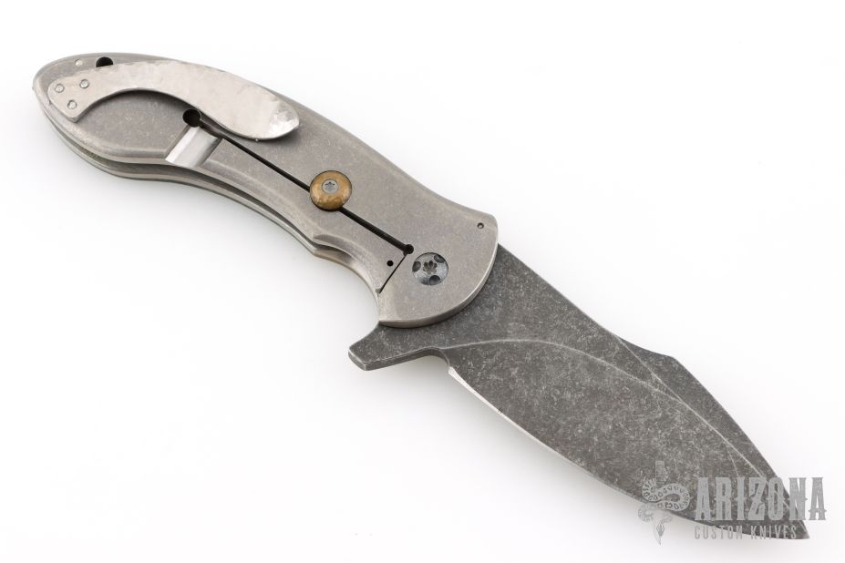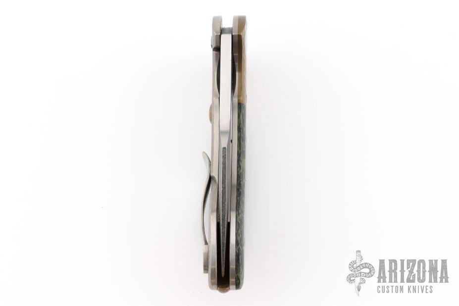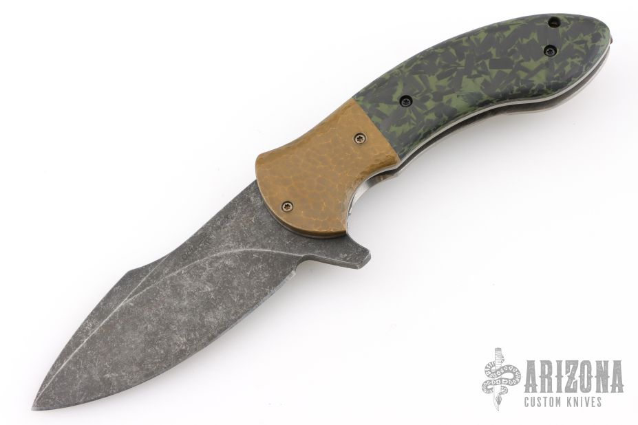 This Orca flipper by Eric Ochs features a dark tumble finished blade with swedge and flipper. The handle has hammered copper bolsters, black/green shard carbon fiber scale, stonewashed titanium frame with satin edges, hammered titanium pocket clip, hammered copper backspacer and overtravel stop. Nice detent, lock up and blade seating. Rides on bearings. Excellent condition.