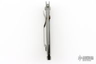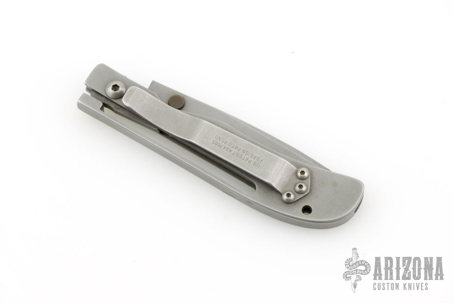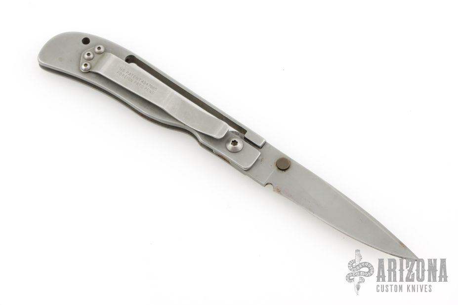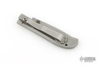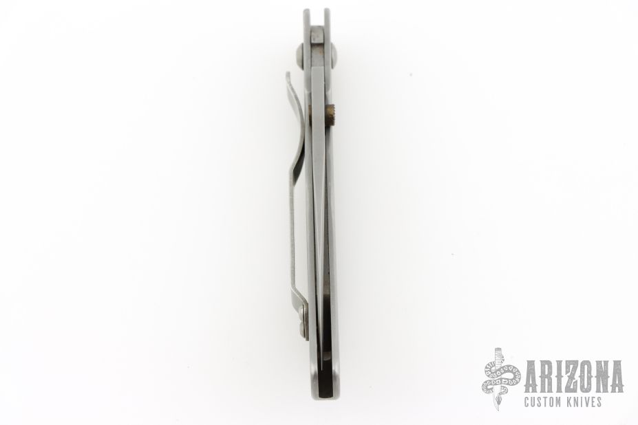 This Top Lock folder by Crawford Knives features a bead blasted drop point blade with single checkered thumbstud and false top edge. The handle has an integral bead blasted stainless steel frame with lanyard hole. Tip up three-hole steel clip. Has some scuffs, scratches, and some spots on the blade, otherwise good condition.