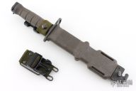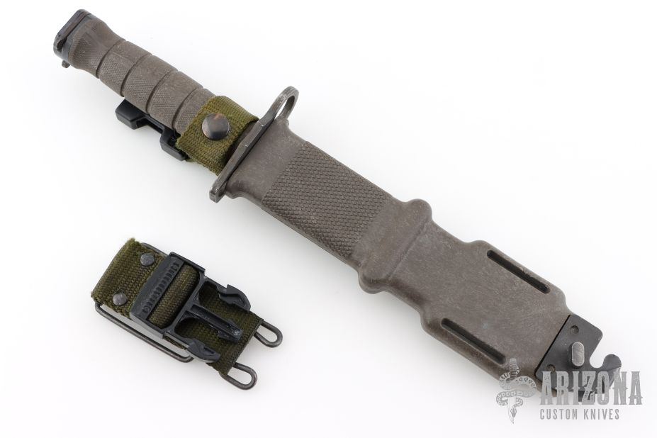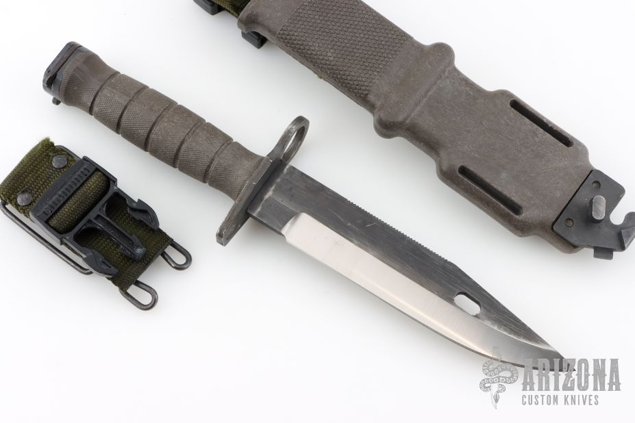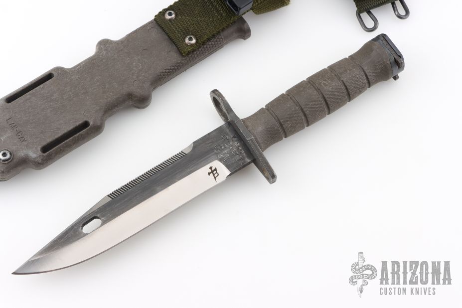 The M9 Bayonet by Lan-Cay was reground by Borka Blades. It has a black blade with satin grinds, sawteeth on the spine and hole in the blade that corresponds with the tab on the sheath to act as a wire cutter, .235" blade stock and 1.452" blade depth, hidden tang construction. The handle has a steel guard and butt with green nylon grip. Comes with original sheath. Has some scratches, but that's the way the came to Borka when he reground them. Comes with original box and COA dated 2020. Excellent condition.
