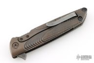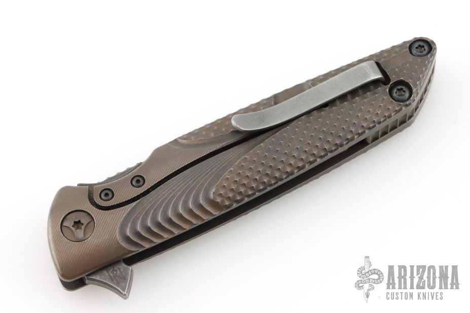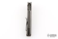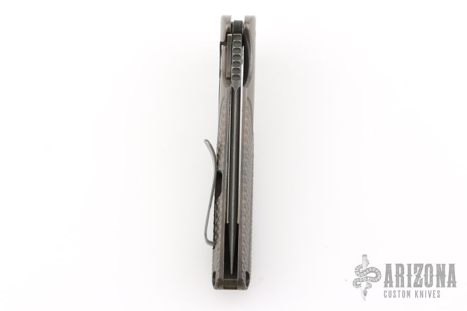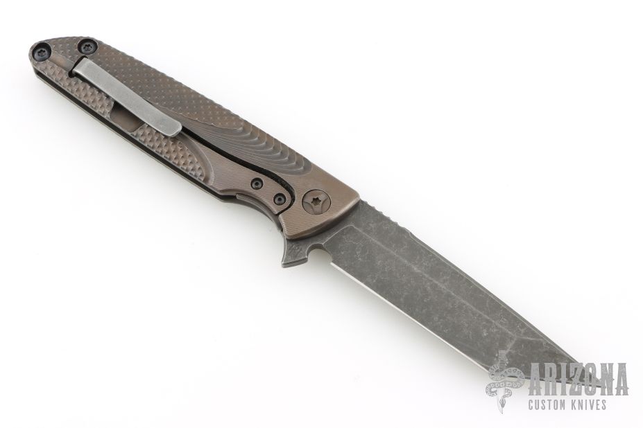 This Typhoon Framelock Flipper from Brian Nadeau / Sharp by Design has a dark tumble finished, tanto shaped blade with notched thumb rest and swedge. Handle is milled 6AL-4V titanium with anodizing, stainless steel tip up clip, stainless steel lock bar insert, and milled titanium backspacer. Flips wonderfully. Excellent lockup and detent, with dead center blade seating. Beautiful piece. Has a couple light scuffs and scratches, otherwise excellent condition.