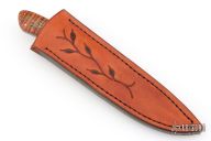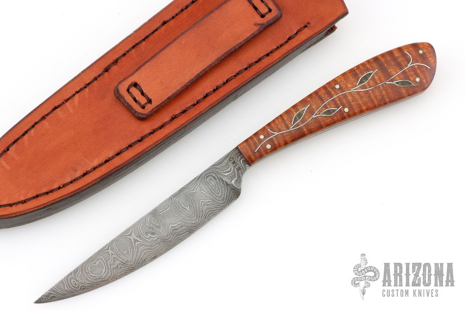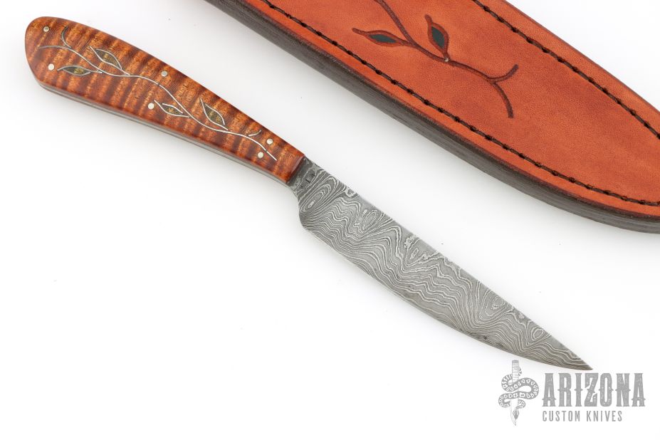 This knife by Chris Owen features a hand forged drop point Damascus (320 layers) blade with .130" bladestock and .72" blade depth with tapered tang construction. The handle has a pinned curly maple grip with vine pattern silver wire inlays. Comes with leather belt sheath. The knife has a little patina. Excellent condition.