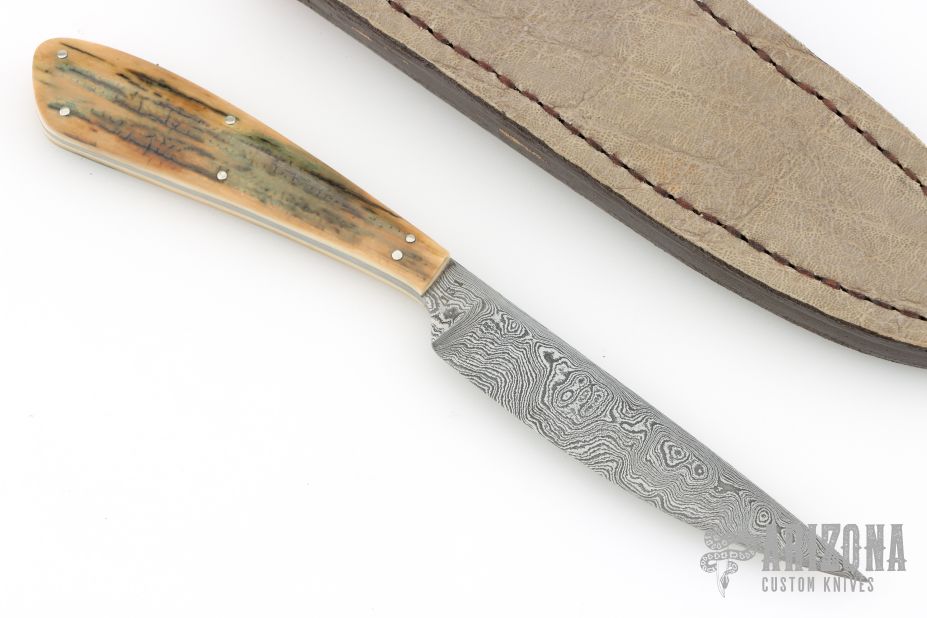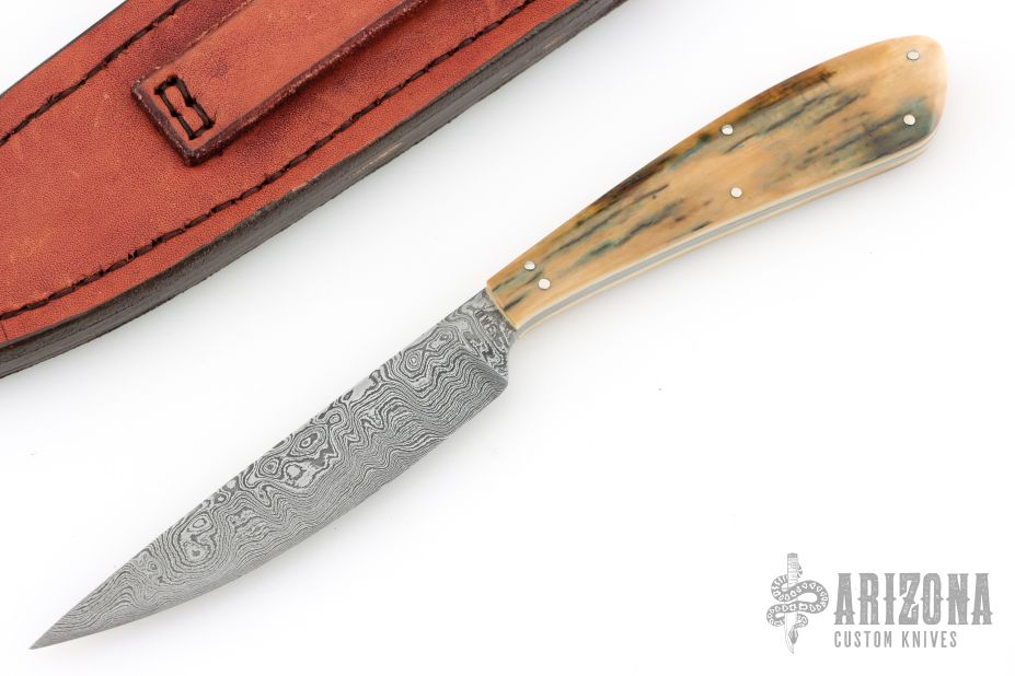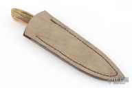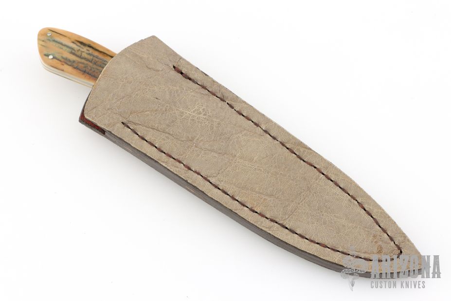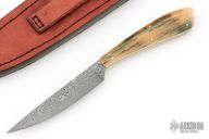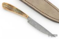 This knife by Chris Owen features a hand forged drop point Damascus (320 layers) blade with .120" bladestock and .714" blade depth with tapered tang construction. The handle has pinned mammoth covers. Comes with leather belt sheath. The knife has a little patina. Excellent condition.