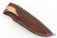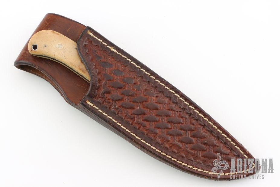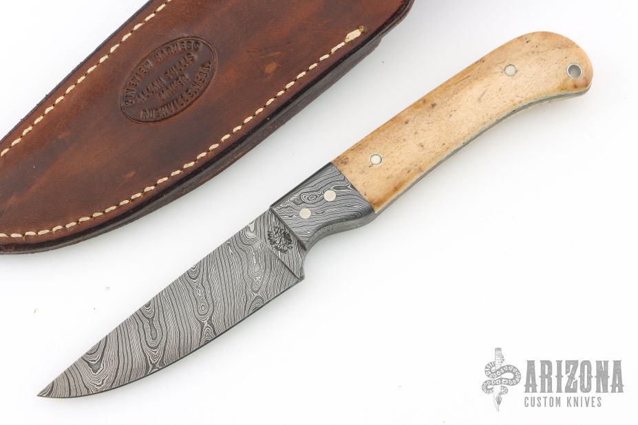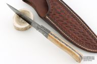 This knife from Jason Tiensvold features a Twist pattern Damascus drop point blade with pinned Damascus bolsters, Oosik covers, .128" blade thickness and .971" blade depth. Full tang construction with a lanyard hole in pommel. Well-balanced and lightweight with a great feel in the hand. Custom made for the consignor to their specifications and design in 2002. Comes in a leather belt sheath. Has a couple light scuffs and scratches, excellent condition otherwise.