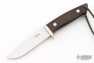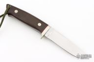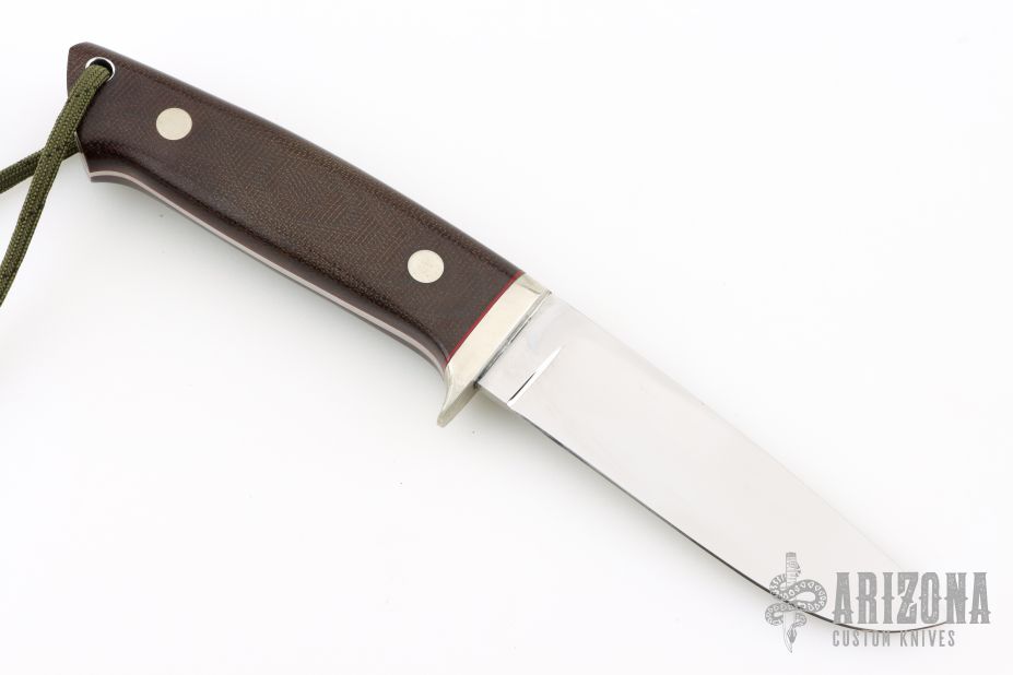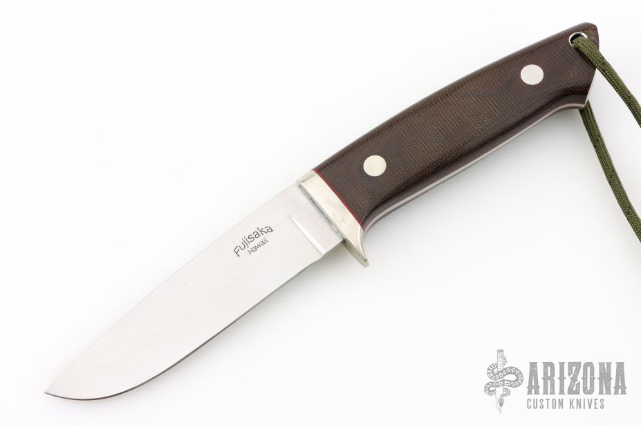 This Loveless design by Stan Fujisaka features a mirror polished blade with .136" blade stock and 1.088" blade depth, full tapered tang construction. The handle has a nickel silver guard, brown canvas micarta scales with red liners, lanyard hole. Excellent condition.