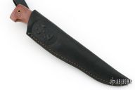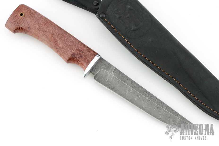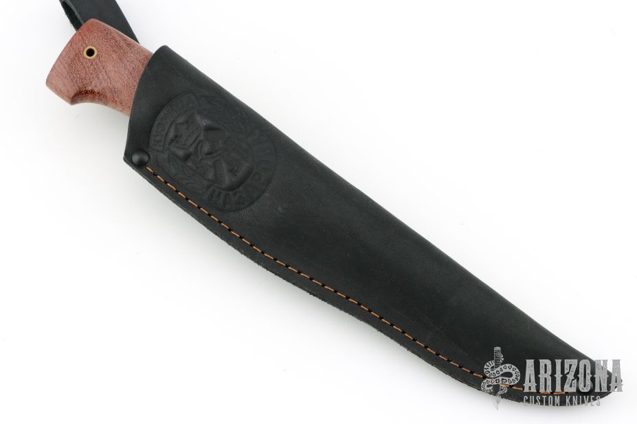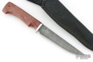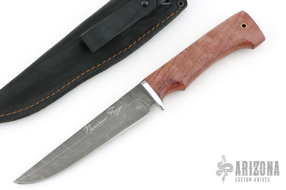 This Hunter by Nazarov Forge features a Damascus blade with false top edge, .094" blade stock and 1.188" blade depth, hidden tang construction. The handle features a nickel silver guard, Bubinga wood and lanyard hole in pommel. Comes with COA and leather belt sheath. Has some light scratches, excellent condition.