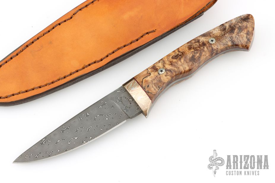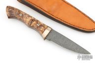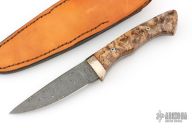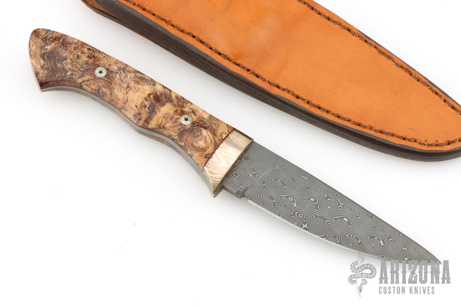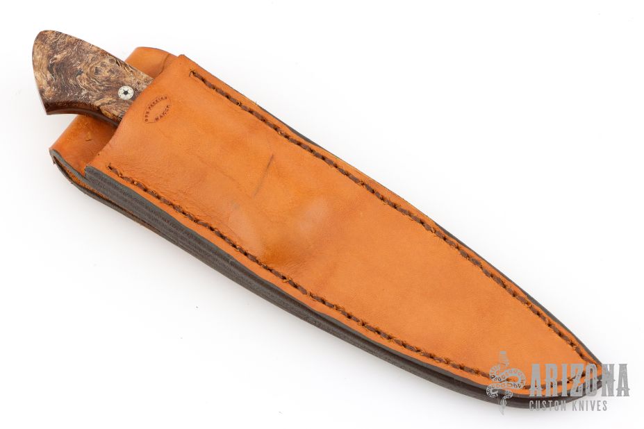 This Hunter by Don Parrish features a Damascus blade with .171" blade thickness and 1.082" blade depth, full tang construction. The handle has a Mokume guard walnut burl scales. Comes with a brown leather sheath. Has a few light scratches, otherwise excellent condition.
