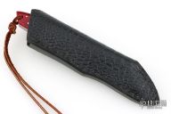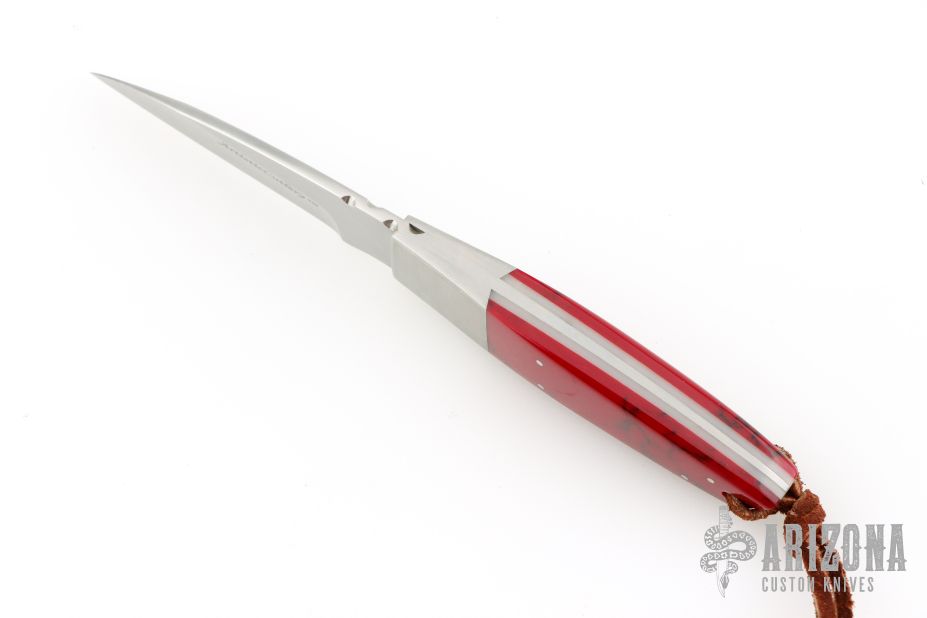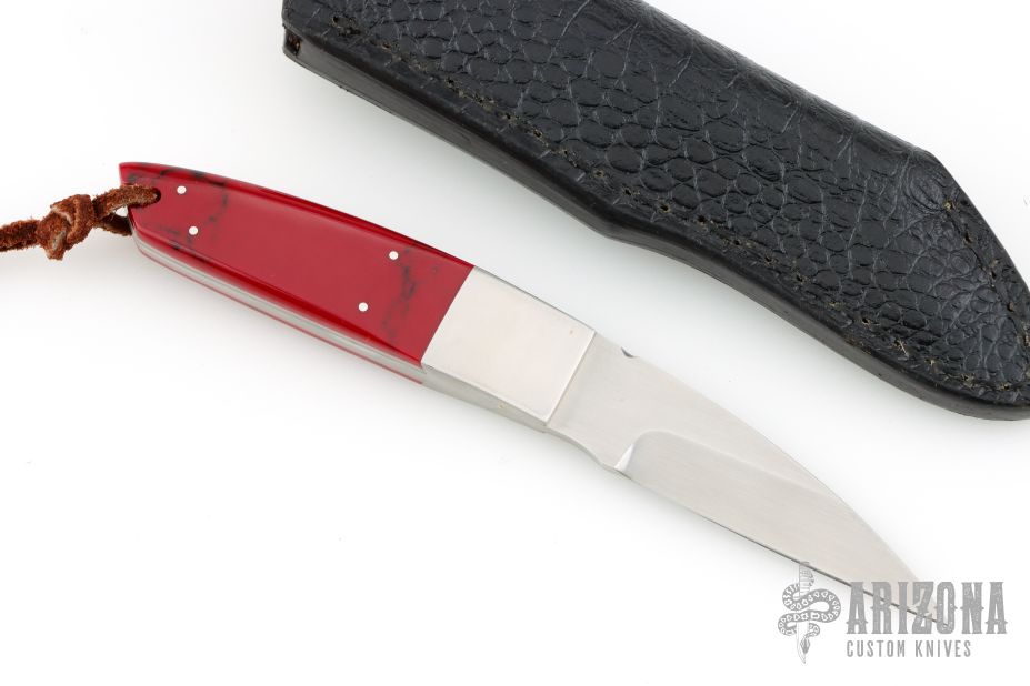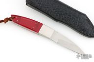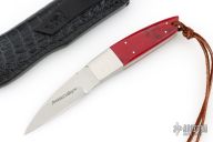This knife by Sam Cox features a hand rub satin finished blade with fileworked thumbrest, .108" blade thickness and .839" blade depth, full tang construction. The handle has dovetailed stainless steel bolsters, pinned red stone covers with white liners. Includes a black leather sheath with belt loop. Excellent condition.