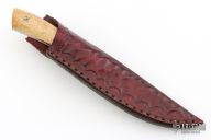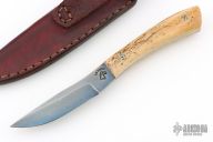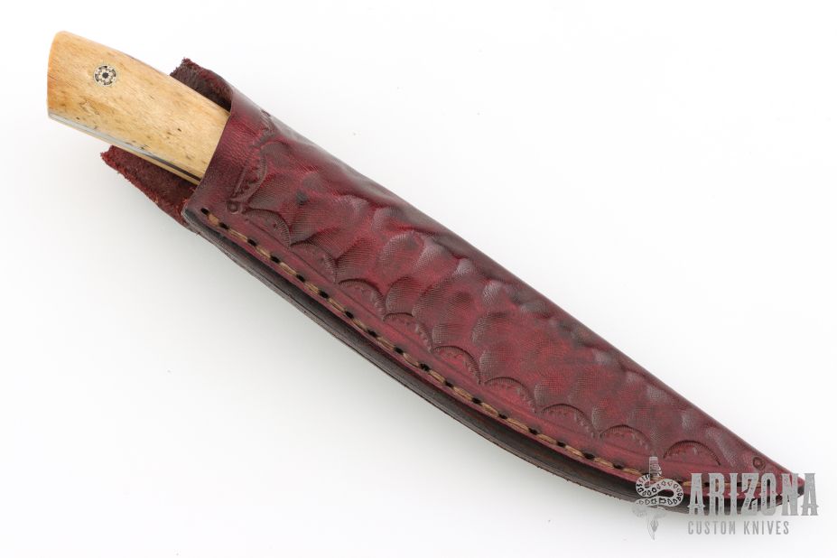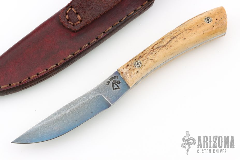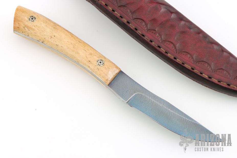 This fixed blade from L.W. Thomsen features a blued "Matrix" pattern Damascus clip point blade with .149" blade stock and .824" blade depth, full tang construction. The handle has bone covers, and mosaic pins. Comes with a leather belt sheath. Excellent condition.