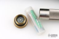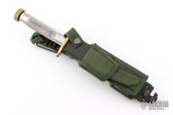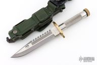 This Survival Bowie by Floyd Byrd features a two-tone blade with false top edge, saw teeth and fullers, .229" blade stock and 1.413" blade depth, hollow handle construction. The handle has a brass guard with lashing holes, knurled stainless steel grip, removable knurled brass butt cap with a compass. Comes with a green plastic sheath with extra pouch and wire cutter attachment. The hole in the blade lines up with the tab on the end of the sheath to be used as a wire cutter. #00759 on the blade. Excellent condition. This knife was made in 2007 and was #59. This knife comes with a letter from the maker stating that this is the last to be released of the 71 knives in this run as it has been in his families collection all this time.