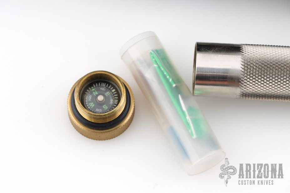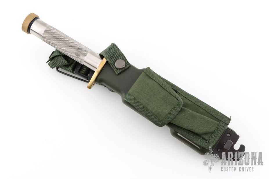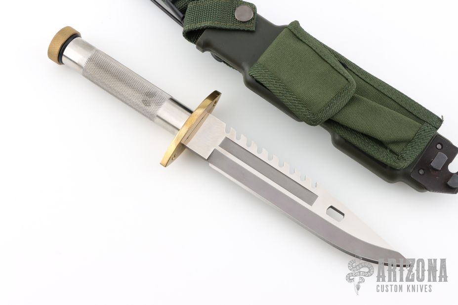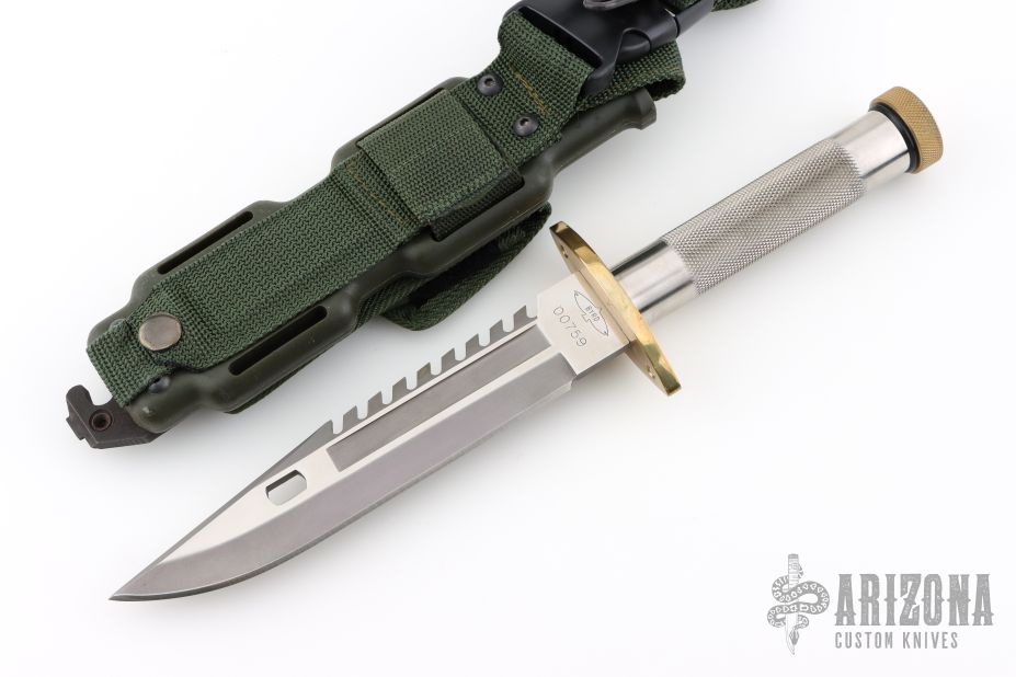 This Survival Bowie by Floyd Byrd features a two-tone blade with false top edge, saw teeth and fullers, .229" blade stock and 1.413" blade depth, hollow handle construction. The handle has a brass guard with lashing holes, knurled stainless steel grip, removable knurled brass butt cap with a compass. Comes with a green plastic sheath with extra pouch and wire cutter attachment. The hole in the blade lines up with the tab on the end of the sheath to be used as a wire cutter. #00759 on the blade. Excellent condition. This knife was made in 2007 and was #59. This knife comes with a letter from the maker stating that this is the last to be released of the 71 knives in this run as it has been in his families collection all this time.