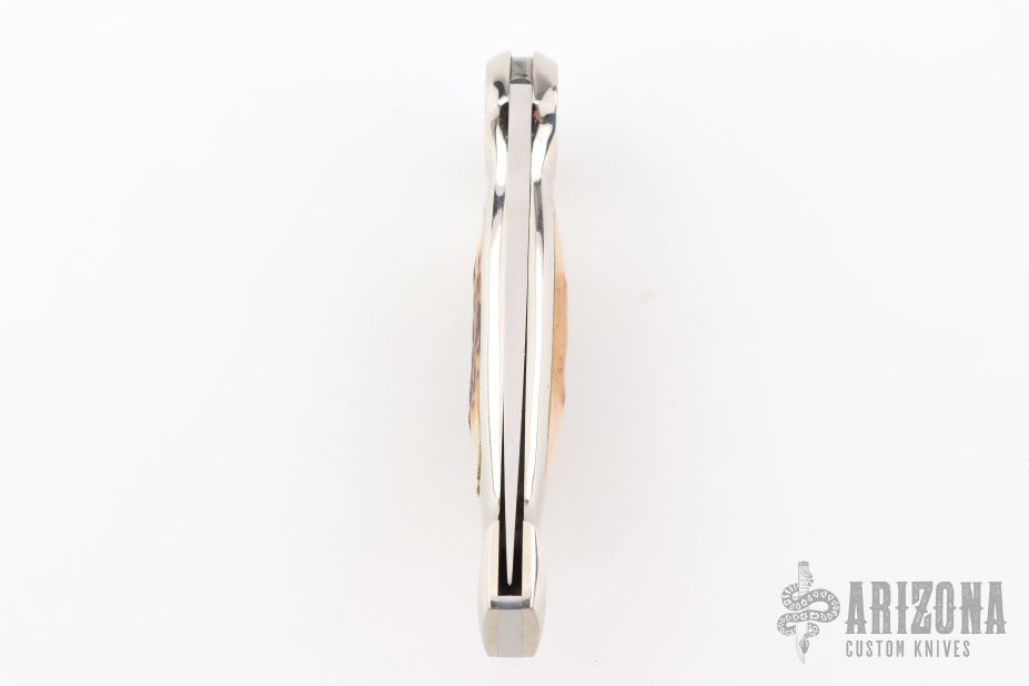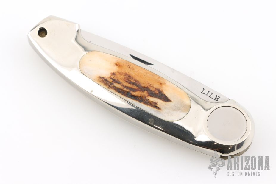 This Button Lock Folder from Jimmy Lile features a satin finished blade with nail nick, #205 on blade. The handle has a nickel silver frame with stag inlays. Large button lock release mechanism used to open and close the knife. Numbered "82" on inside of backspacer. Has a couple light scratches, otherwise excellent condition.