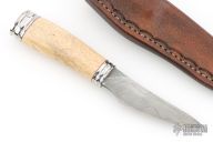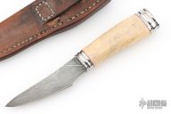 This Skinner by Willie Rigney features a hand forged drop point Damascus blade with .234" blade stock and .905" blade depth. The handle consists of fluted steel collar and cap, with Oosik grip; hidden tang construction. Comes with a leather belt sheath. Has a light patina, excellent condition.